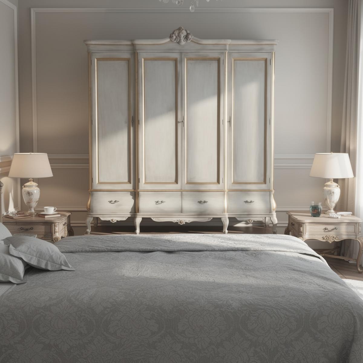 L’Armoire Baroque de Luxe Multi-Portes en Finition Ivoire et Or avec Base de Rangement Courbée est une expression souveraine de la tradition intérieure classique européenne, réalisée à une échelle et un niveau dignes des résidences privées les plus distinguées. Construit en bois massif de première qualité et fini d’une magnifique laque ivoire vieillie à la main — sa surface porte la douce chaleur d’un blanc vieilli adouci par une subtile patine argentée — ces étagères de luxe sont enrichies partout de détails en feuille d’or appliqués à la main qui soulignent chaque cadre de porte, bord de corniche et pied cabriole d’un doré lumineux et discret. Quatre portes pleines à panneaux de hauteur totale s’ouvrent pour révéler un intérieur généreusement proportionné, parfaitement adapté au rangement et à l’exposition de vêtements fins, collections choisies, volumes rares ou accessoires sur mesure d’exception. Un fronton sculpté à la main couronne la corniche supérieure avec une autorité artisanale singulière, tandis que la base bombe gracieusement courbée — équipée de quatre façades de tiroirs aux formes sinueuses ornées de ferrures en métal coulé à ton antique — complète ces étagères baroques avec la grandeur structurelle d’une véritable pièce d’héritage.