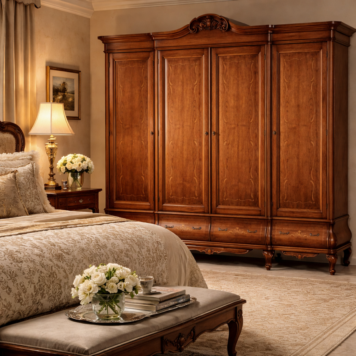 En tant que pièce la plus organiquement riche de notre collection distinguée d’étagères de luxe, ce cabinet s’adresse directement à ceux qui considèrent le grain naturel du bois, la marqueterie posée à la main et les détails sculptés classiques comme les expressions les plus authentiques du mobilier en tant qu’art raffiné. Ceux attirés par cette silhouette rendue dans une palette plus claire et romantique pourront également explorer le Cabinet Étagère Baroque de Luxe Multi-Portes en Ivoire & Or — une pièce compagnon d’une grandeur équivalente qui réinterprète la même forme baroque à quatre portes en laque ivoire vieillie à la main et feuille d’or chaude pour des intérieurs privilégiant l’élégance lumineuse plutôt que la chaleur naturelle. Ensemble, ils définissent l’excellence complète des étagères en bois multi-portes disponibles à cette échelle et ce niveau de qualité.