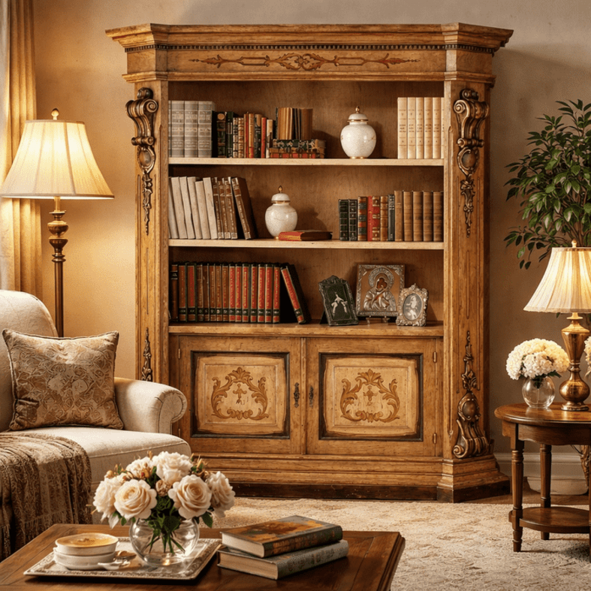 Dans un aménagement d’armoire en bois pour salon, cette pièce joue à la fois un rôle fonctionnel et un point focal. Elle soutient un mode de vie qui évolue au fil de l’année : exposez vos lectures fraîches et votre nouvelle décoration sur les étagères supérieures, puis rangez les accessoires du quotidien en dessous. Que vous construisiez un cadre classique ou ajoutiez une texture patrimoniale à un mobilier moderne, la silhouette baroque de l’armoire apporte un raffinement incontestable. L’effet global est chaleureux, accueillant et soigneusement composé — étagères ouvertes pour l’expression, rangement fermé pour le contrôle — ce qui la rend idéale pour les espaces de réception, les coins lecture et l’organisation élégante de la maison. Pour les salons unisexes qui réclament beauté et réelle fonctionnalité, cette armoire offre un savoir-faire d’exception à apprécier au quotidien. Ceux qui souhaitent explorer une interprétation plus grandiose et expansive de la même tradition baroque à baie ouverte peuvent découvrir le Baroque Luxury Wooden Shelve Cabinet with Central Open Bay — une pièce compagnon d’une ampleur architecturale qui apporte la même chaleur du bois naturel et les détails sculptés classiques à une composition tripartite de bibliothèque couvrant un mur.