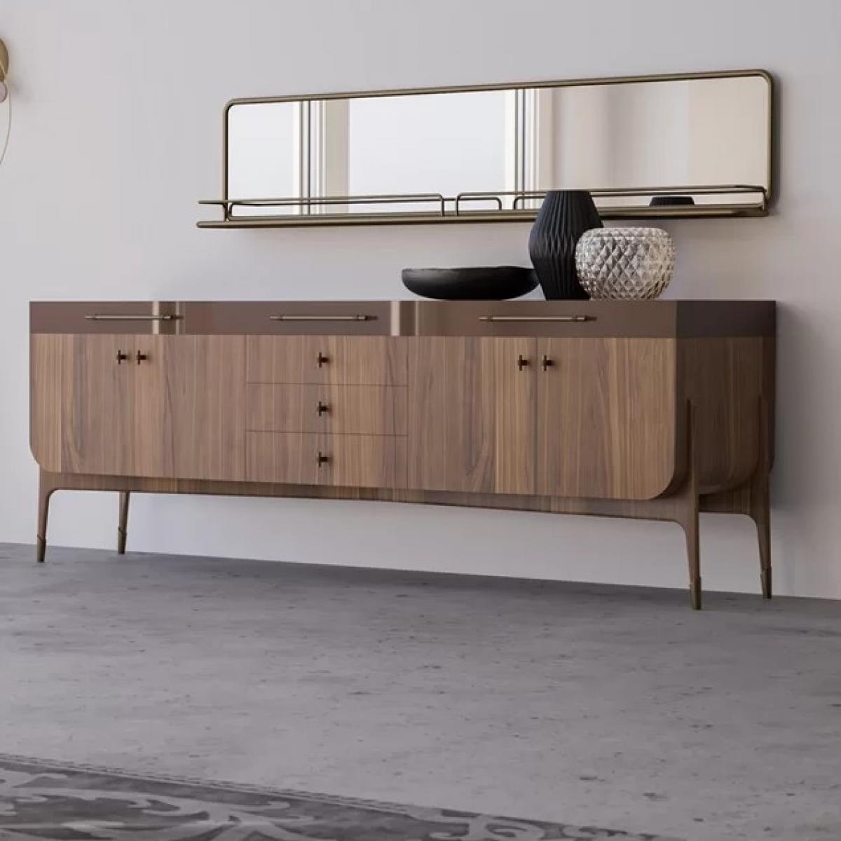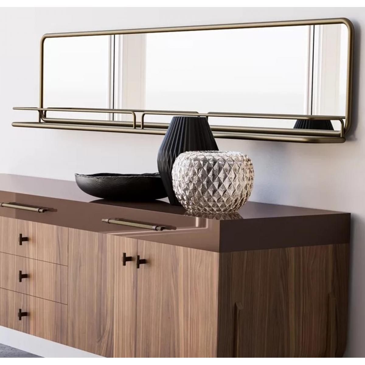Ce qui distingue ce miroir, c’est sa fonctionnalité intégrée avec une étagère miroir. Cette tablette pratique offre un emplacement idéal pour exposer de petits objets décoratifs tels que des photos encadrées, des flacons décoratifs, des bougies ou des articles de retouche quotidiens, vous aidant à garder votre surface organisée tout en affichant un style soigné. L’étagère crée un rythme visuel naturel en harmonie avec le miroir, rendant votre mur à la fois complet et esthétique, loin d’être purement décoratif. Associez ce miroir au Buffet Cabinet en Bois Foncé de Luxe pour créer un point focal raffiné qui apporte chaleur, profondeur et élégance à votre intérieur.