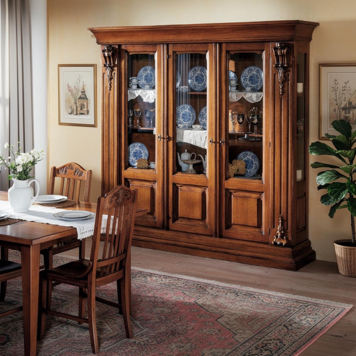 L’intérieur vitré à trois compartiments de cette vitrine de luxe offre un cadre inégalé pour les accessoires de maison de luxe les plus soigneusement choisis — porcelaine de Delft peinte à la main, candélabres en bronze doré, pièces de service en argent sterling et carafes en cristal ancien trouvent tous dans ces étagères leur demeure la plus exquise. Qu’elle ancre une salle à manger formelle ou commande le mur d’un grand salon, cette vitrine ne se contente pas d’occuper sa place — elle définit la pièce elle-même, conférant à chaque intérieur qu’elle habite une atmosphère de raffinement européen durable et une permanence digne d’un héritage.