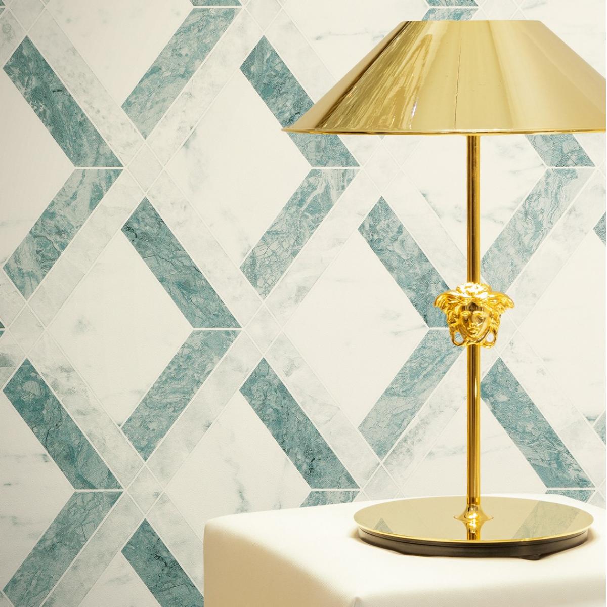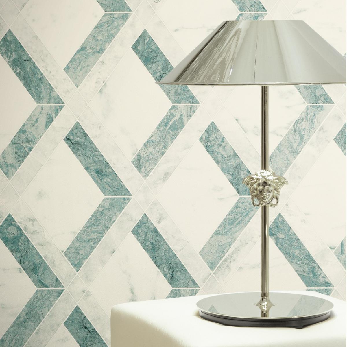 Apportez une touche affirmée et moderne à votre intérieur avec ce papier peint design de luxe présentant un motif Tarsia de Versace. La surface affiche une disposition géométrique nette et répétitive où des formes entrelacées en losanges et en chevrons créent un rythme visuel structuré. Des bordures en contour blanc cassé délimitent chaque panneau avec précision, tandis que des blocs intérieurs vert sarcelle/vert atténué apportent un contraste apaisant. Des lignes de séparation subtiles soulignent l’aspect architectural du motif, et les intersections diagonales en forme de X ajoutent une dimension supplémentaire à la composition. Le résultat global est un look raffiné et design, lisible aussi bien de près que de loin.
