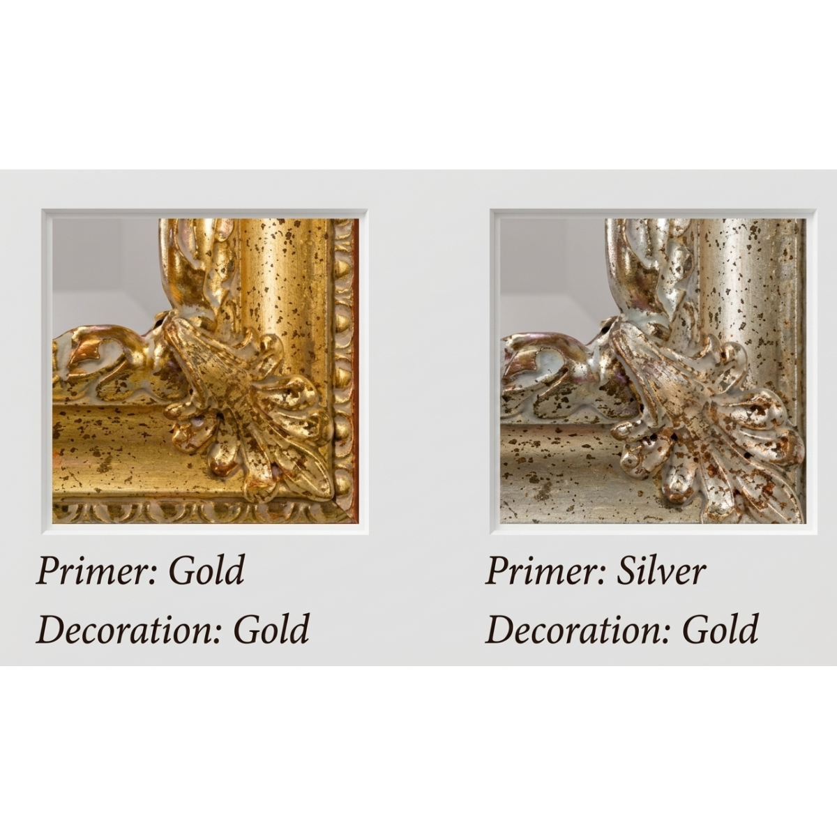 This mirror is presented in its Gold Primer with Gold Decoration finish and is also available in a Silver Primer with Gold Decoration variant — a striking mixed-metal interpretation that retains the warmth of gold leaf decoration against a cooler silver ground. Both finish options are visible in our product gallery, and this piece is further available in other primer and decoration options upon request, allowing each baroque mirror for indoors to be perfectly attuned to the singular vision of its owner.