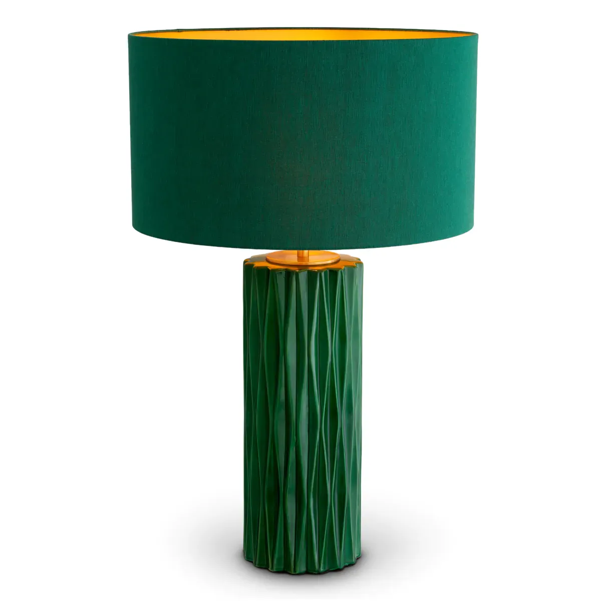 Designed for those who love opulent interiors, this green table lamp is finished with a linen-look shade that softens the glow into a relaxed, ambient warmth. Inside, the luxurious gold lining adds an inviting radiance, so the lamp feels especially captivating in the evening. As a luxury table lamp, it balances bold color with carefully matched materials: tactile ceramic against luminous brass tones, and a softly textured shade that helps prevent harsh glare. Whether placed as a statement beside seating, styled near a bed, or used to bring presence to an entryway console, it creates an atmosphere that feels composed and elevated.