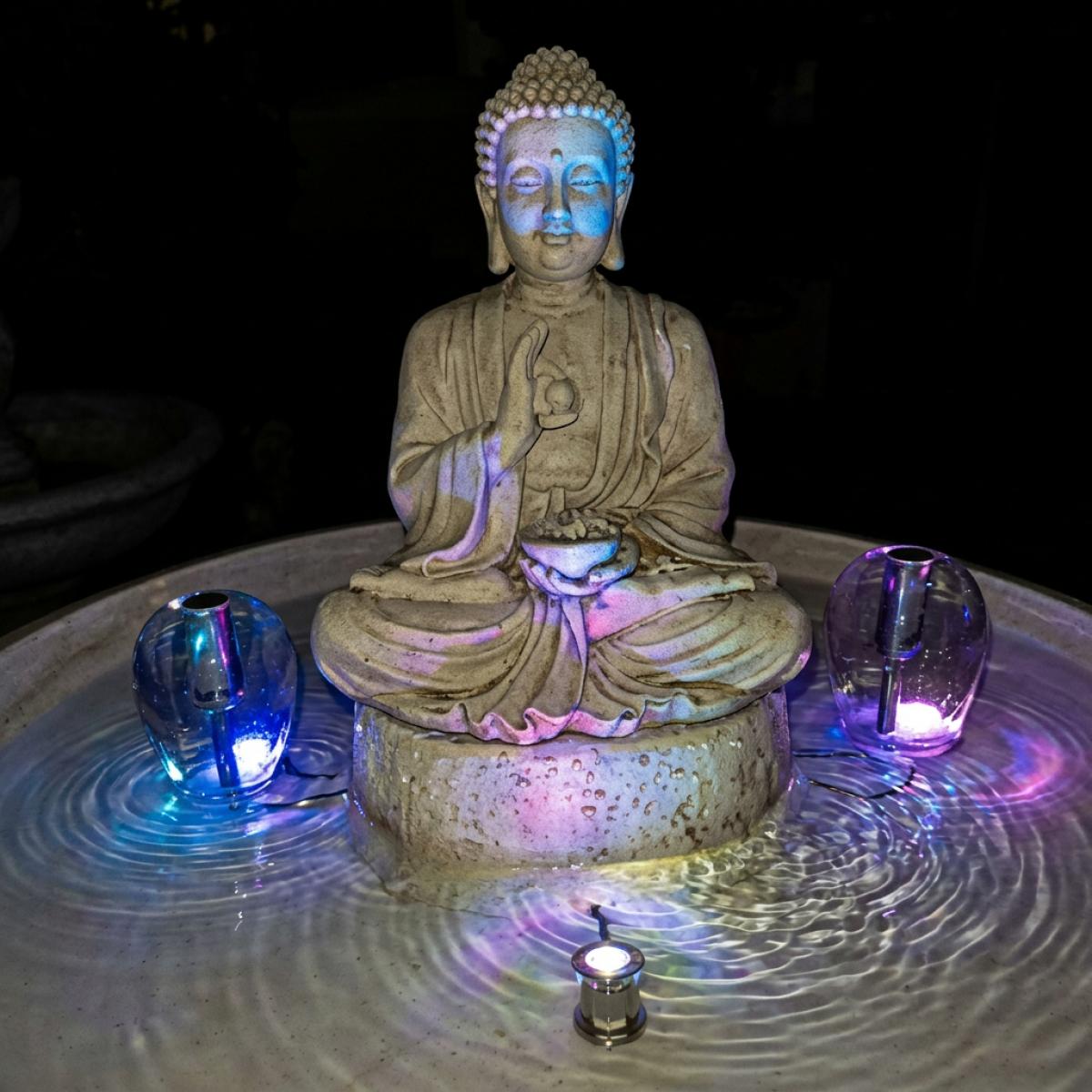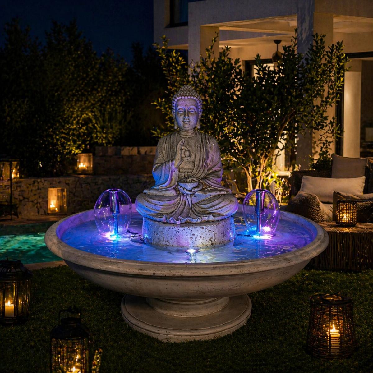 La composizione equilibrata e la profondità scultorea di questa fontana da esterno creano una fusione perfetta tra struttura tradizionale e influenza di design spirituale. Costruita con materiale di alta qualità effetto pietra, questa fontana da giardino esterna garantisce durata e resistenza alle condizioni atmosferiche variabili, mantenendo il suo aspetto raffinato durante tutte le stagioni. La scultura del Buddha introduce una presenza pacifica, mentre l'acqua che scorre crea un'atmosfera acustica rilassante. La compatibilità con illuminazione integrata valorizza ulteriormente l'esperienza visiva, permettendo alla fontana di diventare un elemento affascinante anche nelle ore serali.