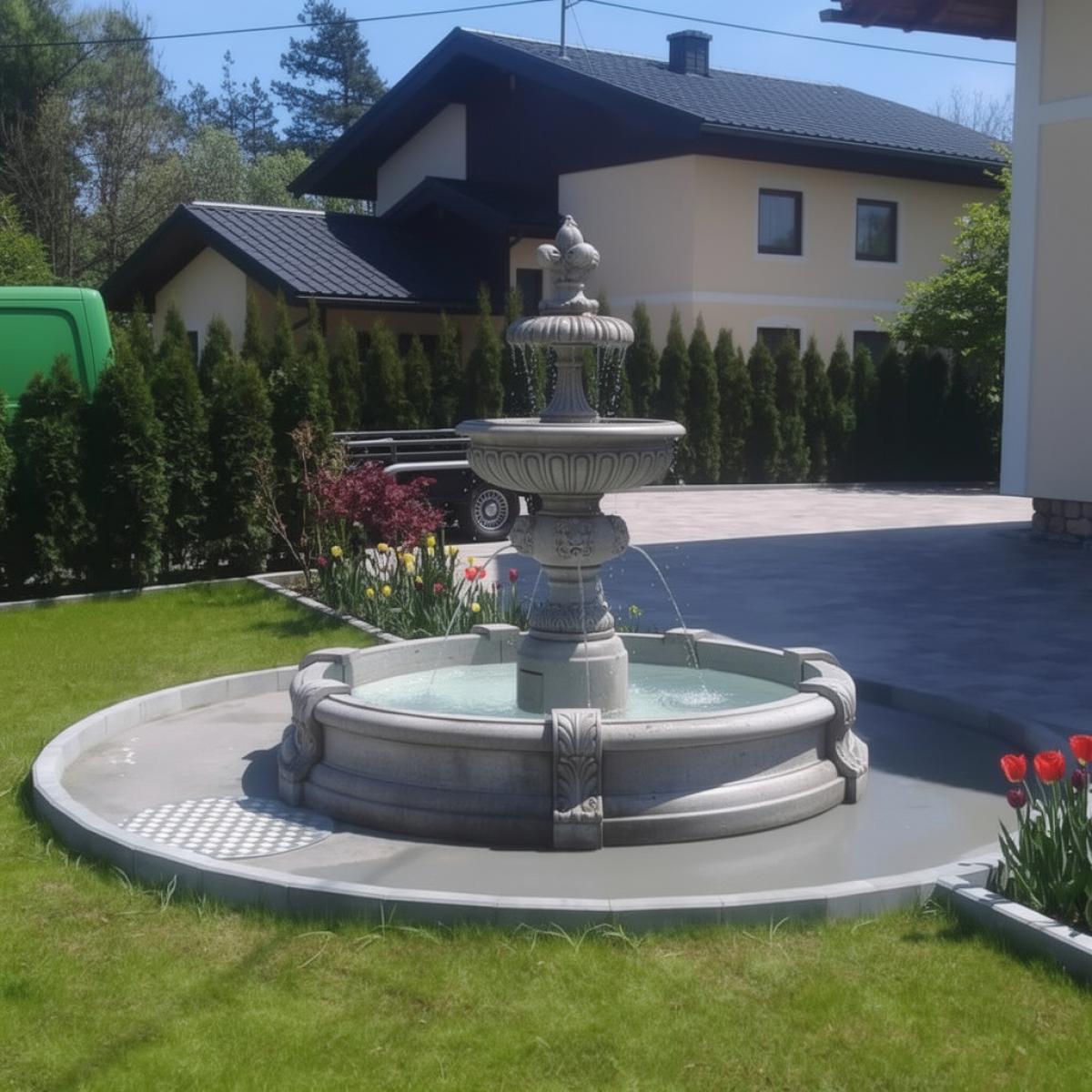 Realizzata in pregiata graniglia di marmo di Carrara, questa fontana è progettata per garantire durata e prestazioni ottimali all'aperto nel tempo. Il grande bacino circolare, incorniciato da raffinati dettagli ornamentali, assicura una presenza imponente in qualsiasi giardino o cortile. Come fontana da esterno di alta gamma, è resistente alle variazioni climatiche, mantenendo intatta la sua finitura elegante e l'integrità strutturale attraverso le stagioni. Le incisioni dettagliate, le ciotole scanalate e il pinnacolo ornamentale sulla sommità ne esaltano l'identità classica barocca, rendendola una vera opera d'arte funzionale.