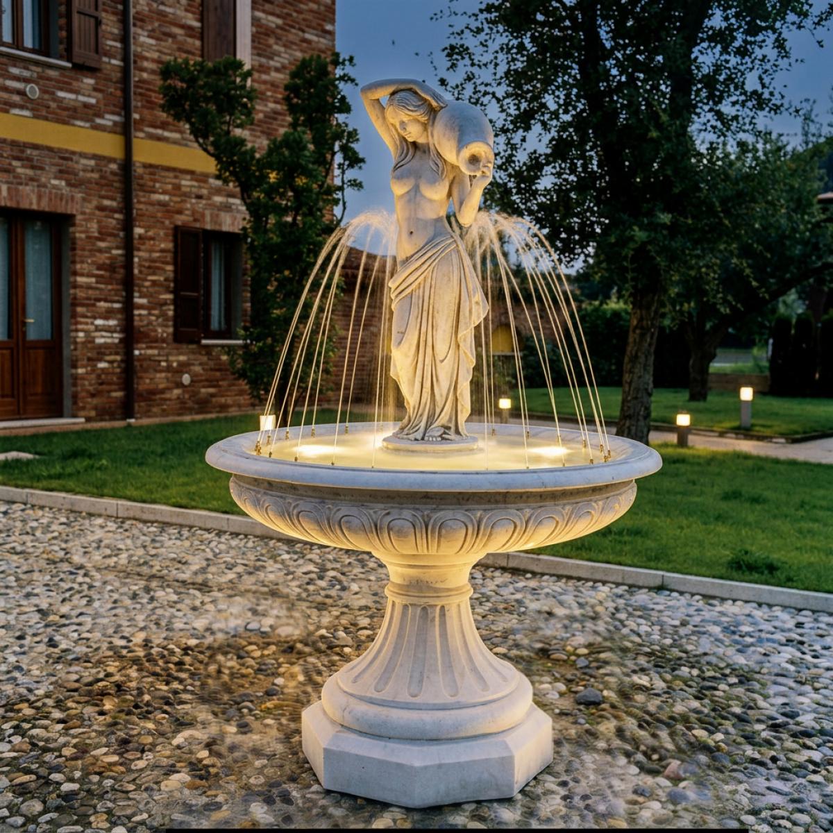 La silhouette fluida e i dettagli artistici di questa fontana art nouveau riflettono una perfetta fusione tra ispirazione classica e raffinatezza scultorea. Costruita con granuli di marmo di alta qualità, questa fontana da giardino esterna è progettata per garantire durabilità e resistenza alle diverse condizioni atmosferiche, assicurando una bellezza duratura nel tempo. La finitura liscia esalta l'eleganza della figura, mentre il delicato flusso d'acqua introduce una dimensione acustica rilassante. Kit opzionali per acqua e illuminazione permettono una personalizzazione ulteriore, creando un effetto luminoso che valorizza l'atmosfera nelle ore serali e aggiunge profondità alla presentazione complessiva.