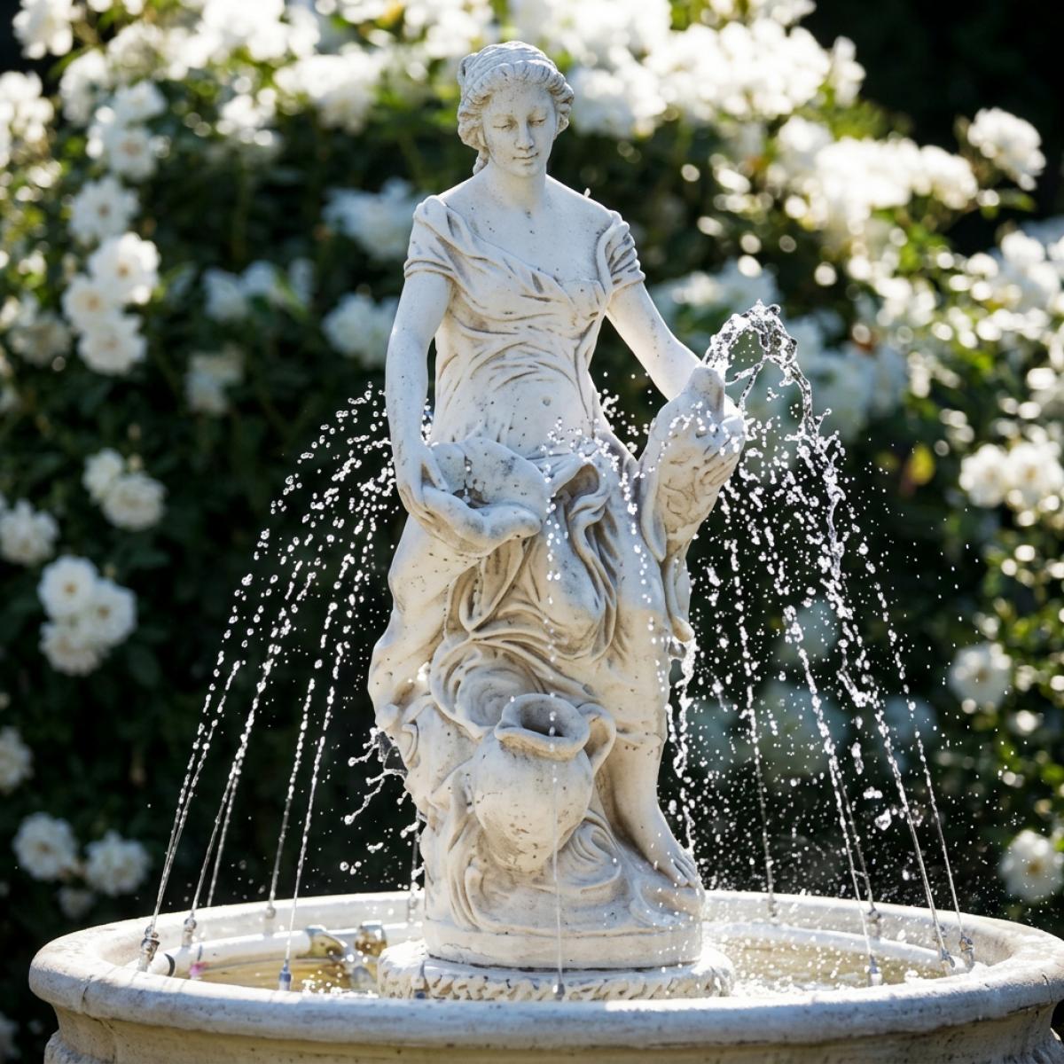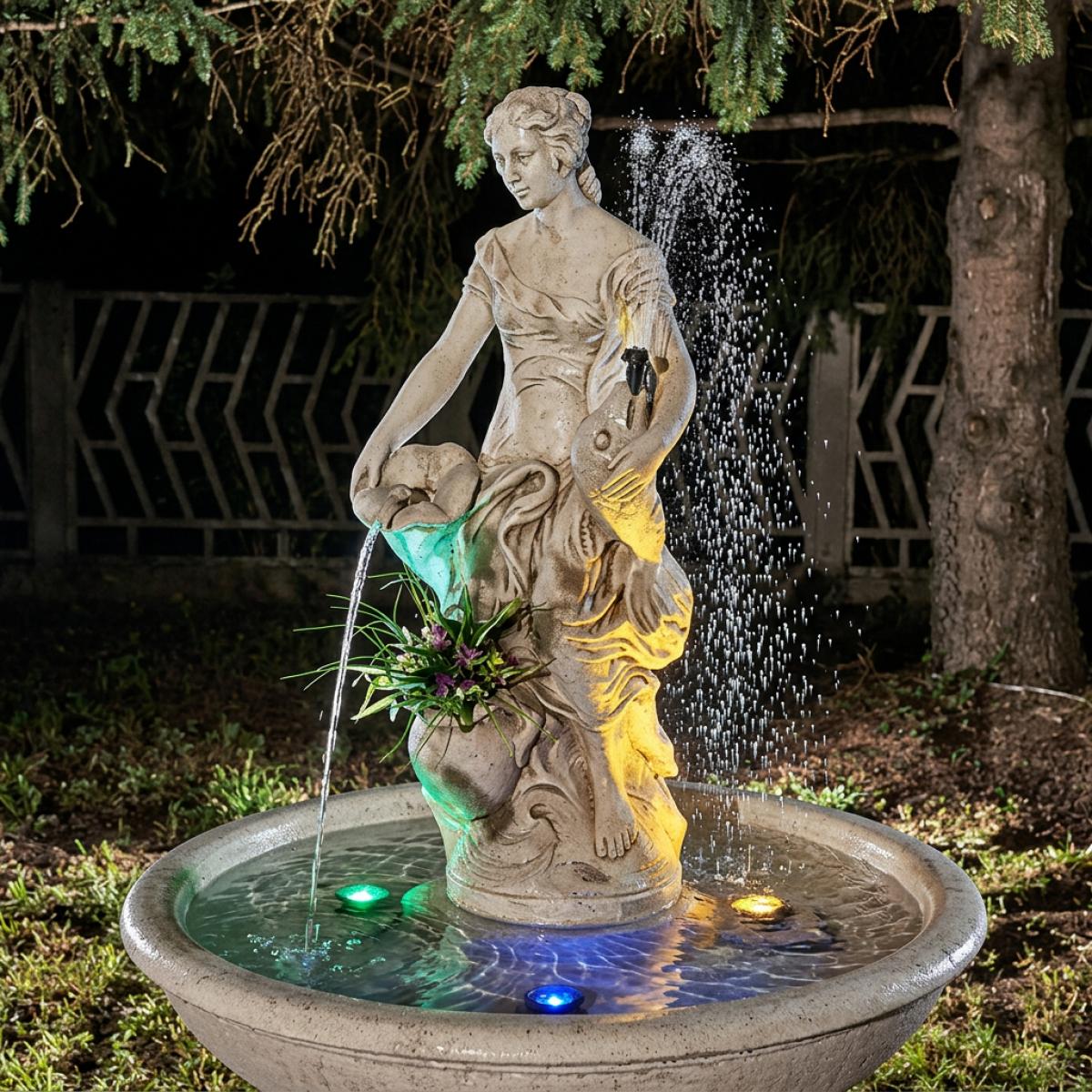 Fontana d'Acqua con Scultura Femminile Barocca di Lusso con Doppio Flusso e Bacino Illuminato è una fontana barocca affascinante che incarna l'eleganza e la fluidità dell'arte classica europea. Al centro, una figura femminile finemente scolpita tiene delicatamente due vasi, permettendo all'acqua di fluire con grazia nel bacino circostante. Questa fontana espressiva crea un gioco dinamico tra movimento e serenità, trasformando qualsiasi ambiente esterno in uno spazio sofisticato e visivamente coinvolgente.