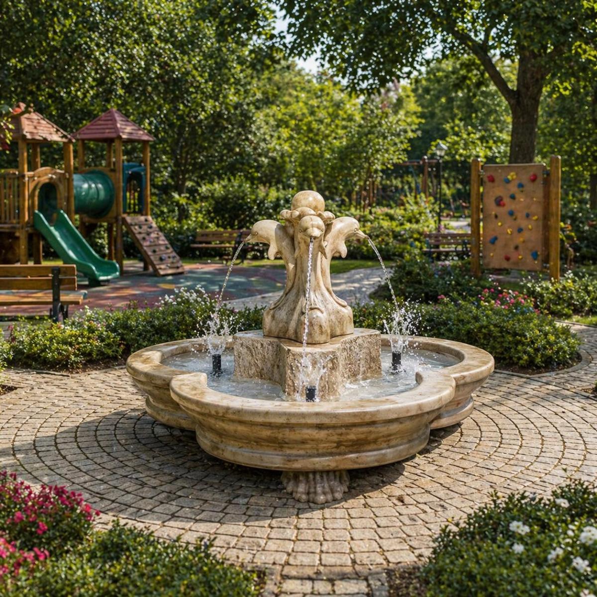 - Elegante fontana barocca artigianale con scultura centrale multi-delfino