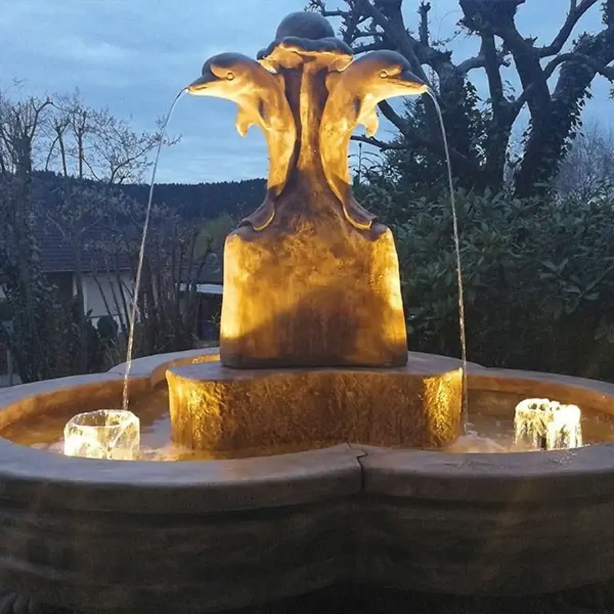 I dettagli scultorei intricati e la struttura equilibrata di questa fontana da esterno riflettono una maestria superiore e un design senza tempo. Costruita in pregiata graniglia di marmo di Carrara, questa fontana da giardino esterno garantisce eccellente durabilità e resistenza alle variazioni climatiche, mantenendo il suo aspetto elegante attraverso le stagioni. La finitura testurizzata valorizza la profondità e il realismo delle forme dei delfini, mentre il flusso continuo d'acqua introduce una presenza acustica calmante. Kit opzionali per acqua e illuminazione permettono ulteriori personalizzazioni, trasformando la fontana in un elemento visivo illuminato di grande impatto durante le ore serali.