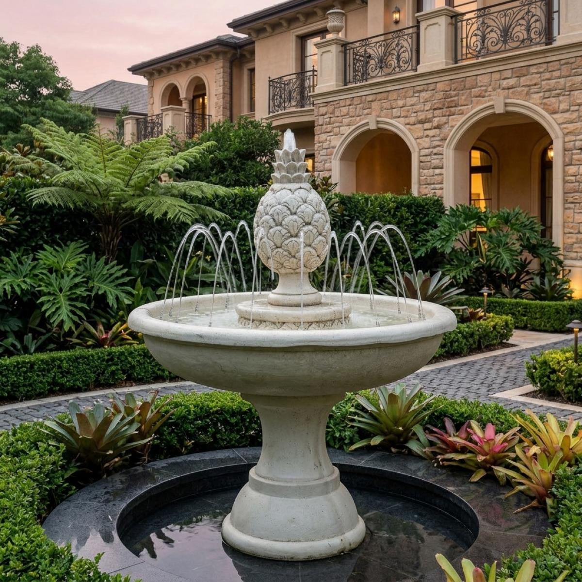 Fontana d'Acqua di Lusso Barocca a Forma di Ananas con Bacino Circolare è una fontana barocca realizzata con maestria che unisce l'ispirazione classica europea a una forma scultorea simbolica. Il motivo centrale dell'ananas, finemente dettagliato con texture stratificate, rappresenta ospitalità e raffinatezza, fungendo da punto focale di questa elegante fontana d'acqua. Circondata da getti d'acqua arcuati con grazia, crea un'esposizione esterna armoniosa e visivamente affascinante.