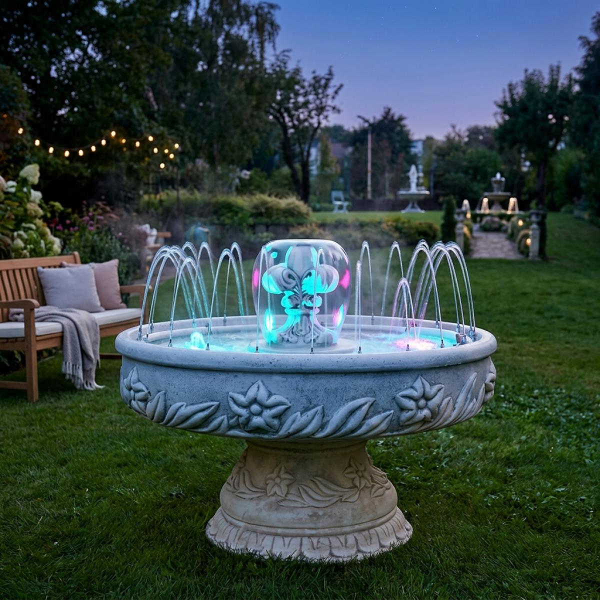 Realizzata con granulato di marmo di Carrara di alta qualità e cemento bianco resistente, questa fontana da giardino esterna offre un'eccezionale resistenza alle intemperie e una lunga durata nel tempo. Il bacino circolare dalle dimensioni generose è sostenuto da una solida base a piedistallo, che rafforza l'eleganza di una tradizionale fontana da esterno. L'illuminazione integrata valorizza sia la struttura floreale sia i getti d'acqua, creando uno spettacolo luminoso che trasforma la fontana in un punto focale, soprattutto nelle ore serali, quando luce e acqua si fondono in modo suggestivo.