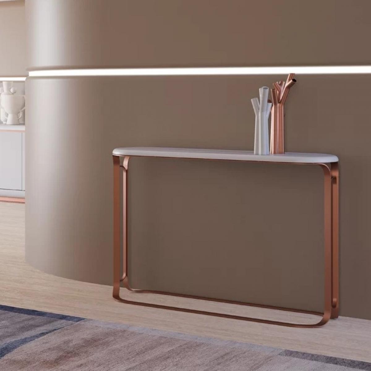 Questa consolle di lusso con piano in marmo bianco e base in rame porta un tocco moderno e minimalista a corridoi e soggiorni, bilanciando leggerezza e struttura. Il piano presenta una superficie solida bianca liscia con un bordo frontale arrotondato, creando una linea visiva più morbida rispetto ai tradizionali design con angoli quadrati. Sotto, la struttura tubolare a forma di U aperta mantiene il profilo sottile e arioso, mentre la base in metallo color rame caldo aggiunge un contrasto che risulta sia caldo che studiato. Progettata per uno styling quotidiano, questa consolle offre un punto elegante per lampade, foto incorniciate e decorazioni stagionali senza creare disordine visivo. La finitura opaca contribuisce a un aspetto calmo e di alta gamma che si integra con interni contemporanei. Scopri la nostra collezione di mobili di lusso per trovare pezzi eleganti pensati per elevare interni sofisticati con stile senza tempo e artigianalità raffinata.