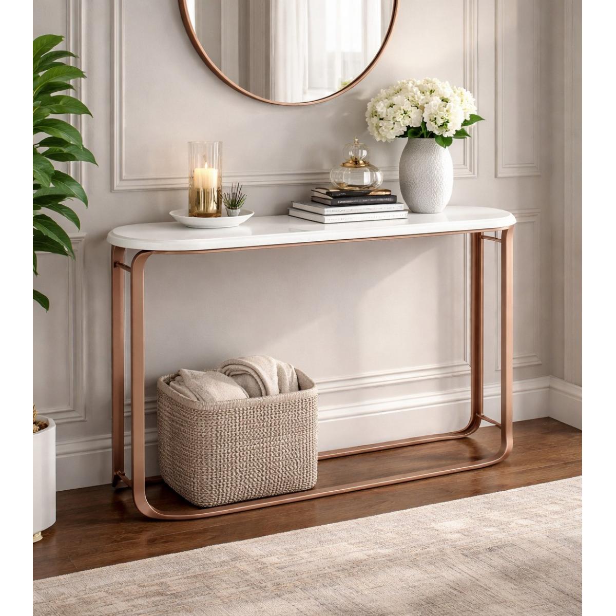 Come consolle con piano in marmo bianco, è progettata per distinguersi fin dal primo sguardo. Il piano rettangolare è rifinito con una superficie bianca raffinata, e i dettagli degli angoli arrotondati continuano l’aspetto liscio e coerente tra piano e struttura. La parte inferiore aperta include una barra/rail perimetrale inferiore sotto il piano, che aiuta a definire la struttura mantenendo una silhouette pulita. Questo look con base in rame è ideale se desideri un pezzo centrale bicolore che risulti elevato ma comunque pratico per l’uso quotidiano. Scopri i design raffinati nella nostra collezione di consolle di lusso, perfetta per aggiungere eleganza e funzionalità a spazi abitativi sofisticati.