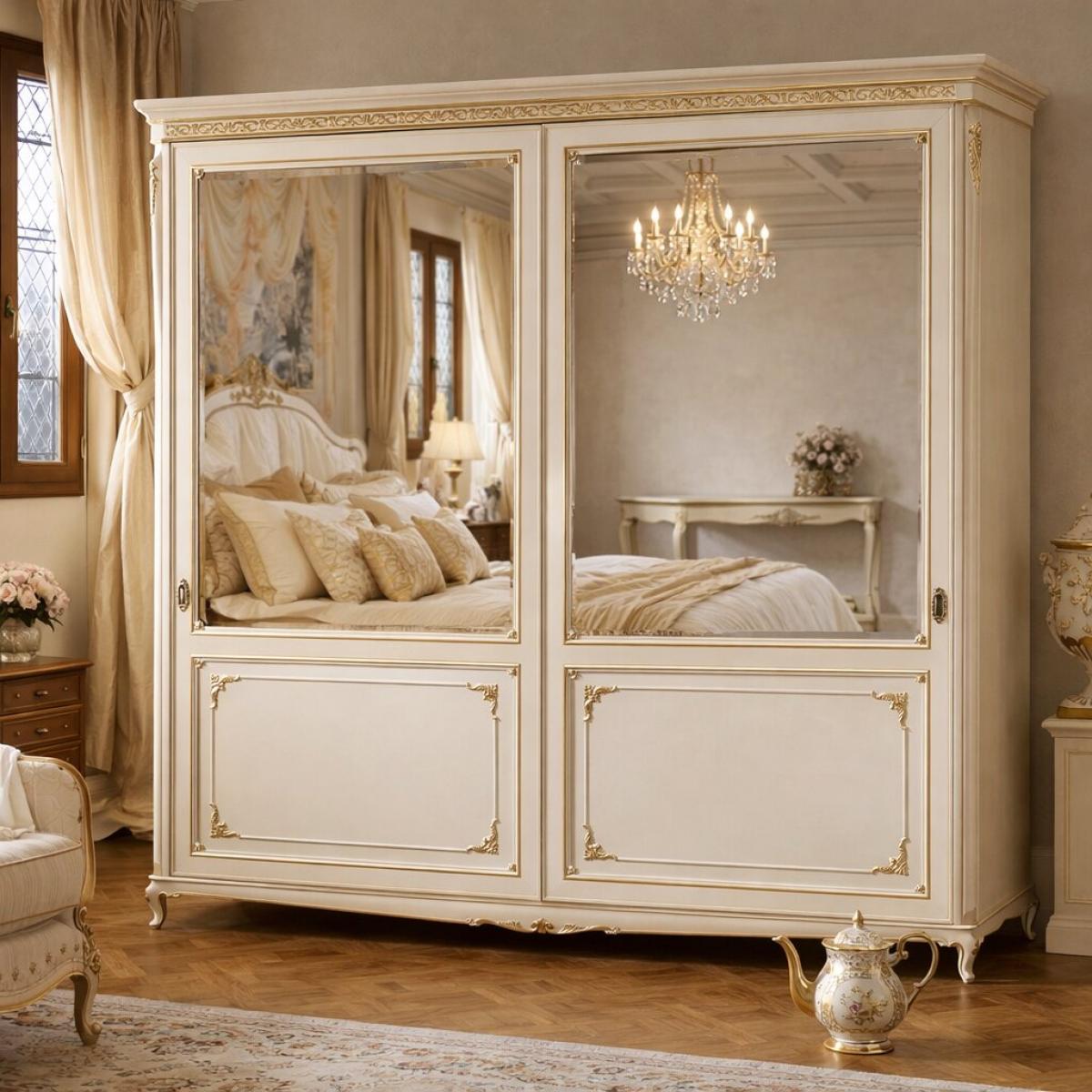 Elegant luxury wardrobe cabinet in ivory finish featuring mirrored sliding doors and decorative gold accents. This baroque wardrobe cabinet combines refined style with functional storage.