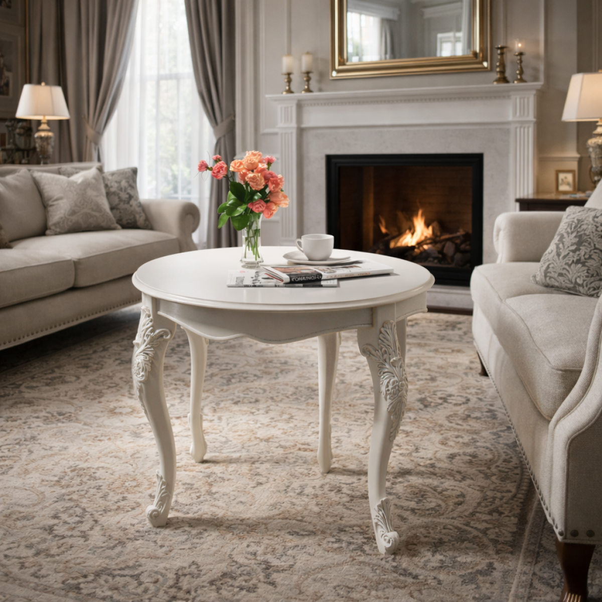 The Ivory Finish Luxury Round Baroque Side Table with Carved Acanthus Cabriole Legs is a piece of singular charm and quiet decorative authority — a testament to the enduring power of the European rococo tradition to produce furniture of extraordinary grace and beauty at even the most intimate of scales. Constructed from premium solid wood and finished throughout in a smooth, refined ivory lacquer of warm and luminous character, this side table presents a perfectly circular top of generous 70 CM diameter — a form that has been beloved of the French and Italian furniture-making traditions for centuries, its continuous curve lending an air of gentle informality and social warmth to any arrangement it inhabits. The underside of the tabletop is framed by a delicately shaped apron that follows the circular form with complete fidelity, its lower edge flowing in a subtle serpentine profile that introduces a note of rococo movement and lightness to the otherwise serene and unadorned surface above. Four sweeping cabriole legs, each one adorned along its entire length with hand-carved acanthus and scroll reliefs of exceptional refinement and botanical fluency, rise from delicately scrolled feet to support the tabletop with a grace and elegance that makes the piece appear almost weightless despite the solidity and quality of its construction. The carvings — rendered in the same ivory finish as the rest of the piece, creating a beautiful tonal unity of surface and ornament — are the work of European master craftsmen whose deep familiarity with the baroque and rococo ornamental vocabulary is evident in every curve, every leaf, and every precisely executed scroll. Positioned beside a sofa, a reading chair, or at the centre of a small seating arrangement, this is a true luxury side table that transforms every surface it graces and every corner it inhabits into a composition of classical European beauty.