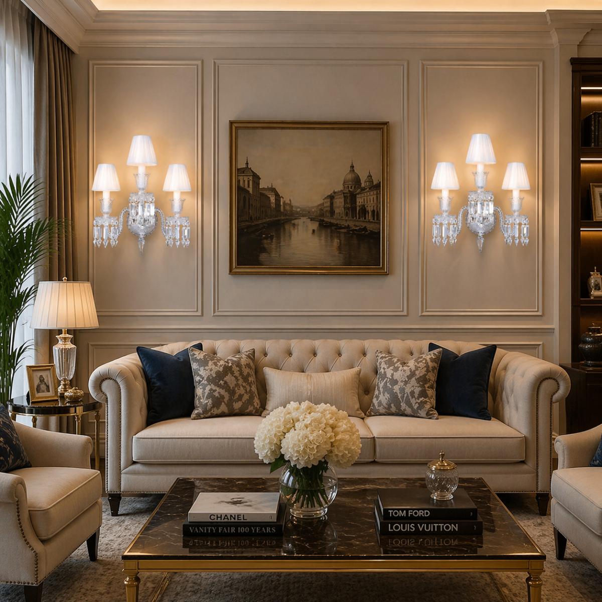 Crafted from Wall lamp materials of metal + crystal, this fixture is built to deliver a polished, high-end look with lasting visual appeal. The design supports 3*E14 light sources, letting you choose the ambiance that fits your home. For flexible styling, it’s available in coverings of Gold and Chrome, so you can match the finish to your existing hardware and decor tones. Whether you’re aiming for an intimate evening glow or a more vibrant sparkle in daytime styling, the Luxury 3-Candle Crystal Wall Lamp with Lampshade offers a refined centerpiece that transforms bare walls into a luminous focal point. Explore our luxury wall lamp collection to discover elegant lighting pieces that bring ambient glow, intricate detailing, and timeless sophistication to your interiors.