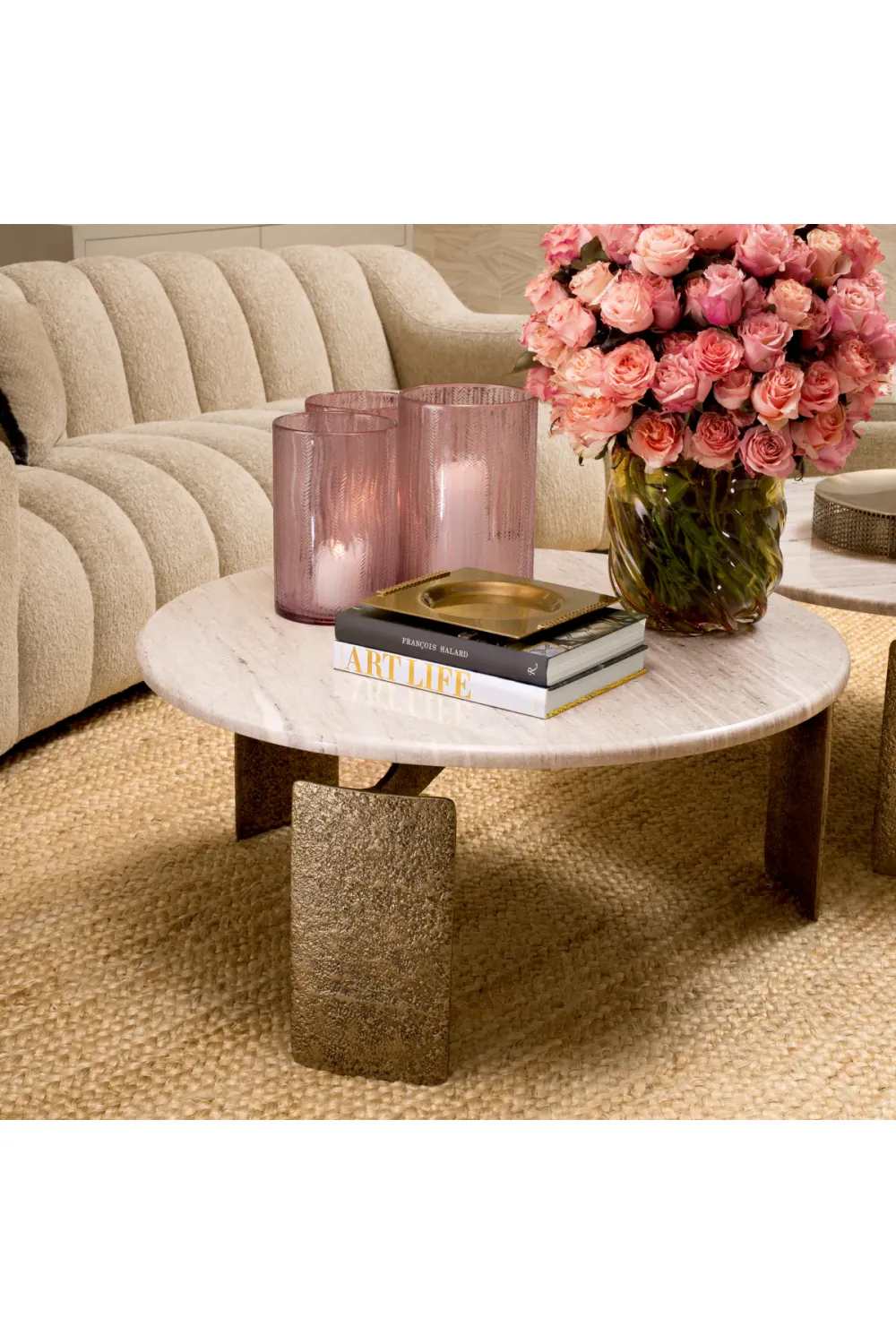 The table is supported by a sculptural antique brass finish coffee table base that adds depth, warmth, and heritage-inspired character. The luxurious beige marble top introduces subtle veining and organic texture, ensuring that each piece feels unique. As a modern coffee table, it complements contemporary, transitional, and luxury décor styles with ease. The rounded form enhances movement within the room, while the marble surface offers a refined platform for décor styling and everyday use. This luxury coffee table effortlessly balances artistic presence with functional appeal.