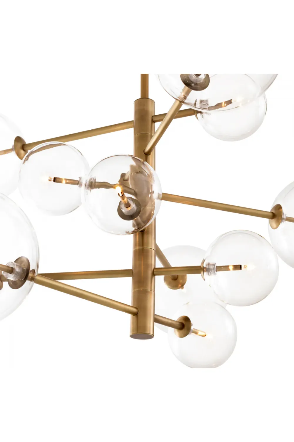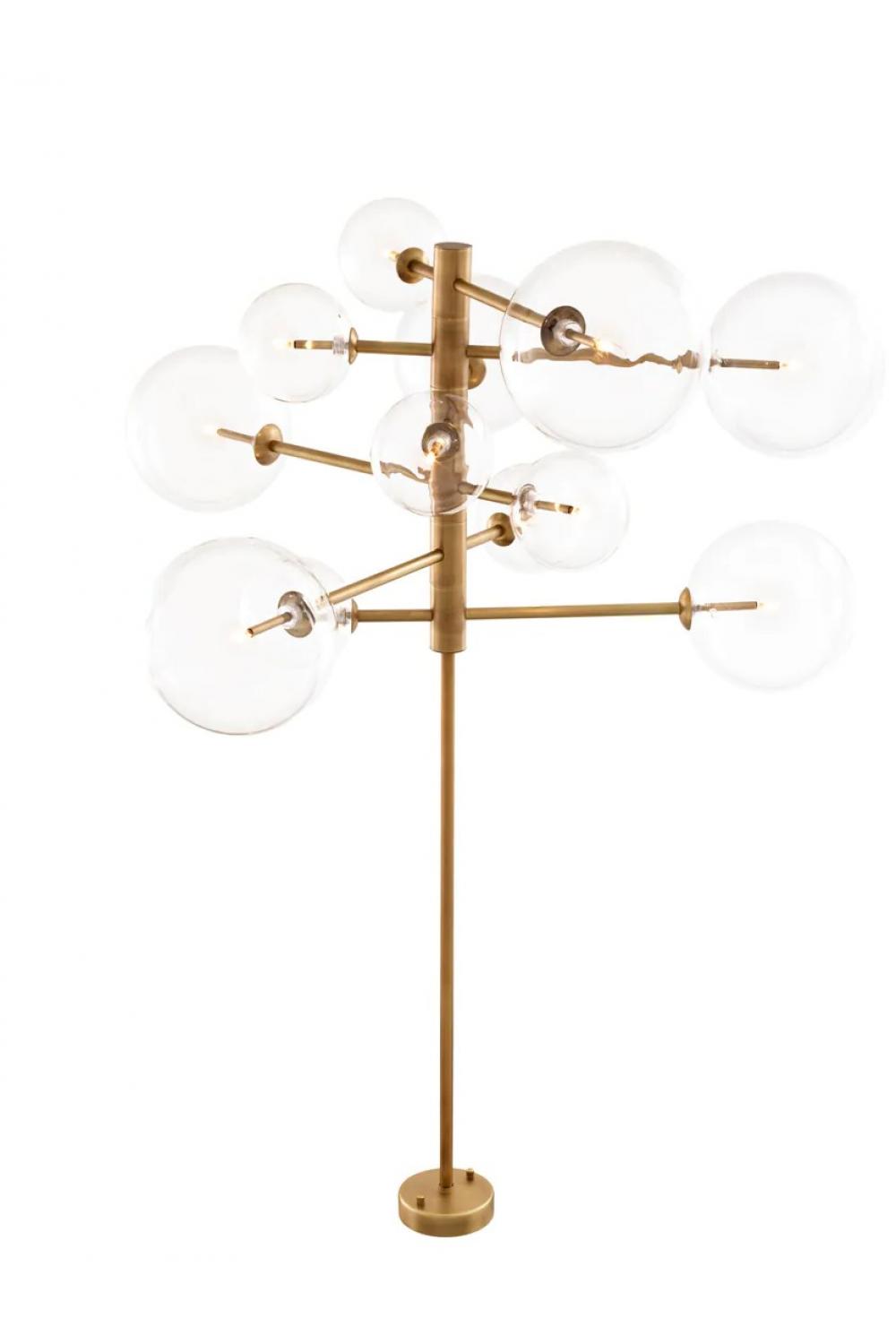 At the heart of this design are the 12 clear glass globes, which are meticulously distributed along the stem to mimic a molecular or botanical form. These artistic glass sphere standing lamp elements provide a clear, brilliant radiance that highlights the elegant brass and glass floor fixture aesthetic. This beautiful designer molecular floor lamp configuration ensures that light is cast in multiple directions, creating a sophisticated interior mood lamp experience that eliminates dark corners. Whether functioning as a statement branched floor lighting piece or an upscale stone base floor lamp, the transparency of the globes allows the intricate brass craftsmanship to be seen from every angle.