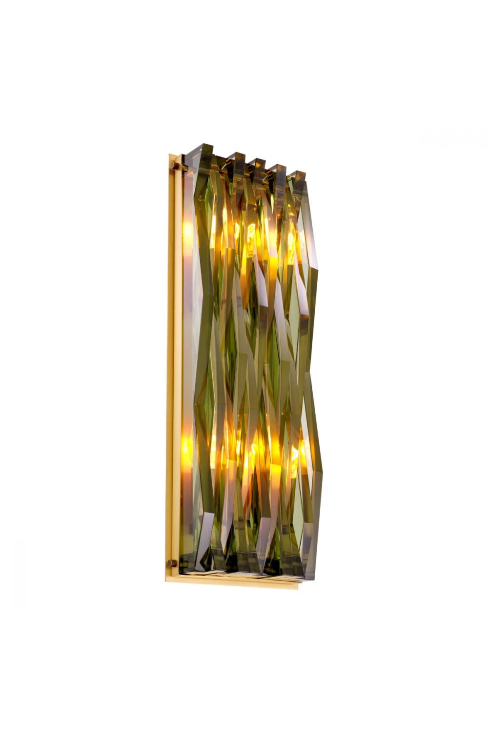 This luxury wall lamp features sculpted green glass mounted on an antique brass structure, creating a bold architectural statement. Designed as elegant luxury wall lamp lighting, it elevates interiors through the refined presence of an antique brass finish wall lamp with striking geometric characte