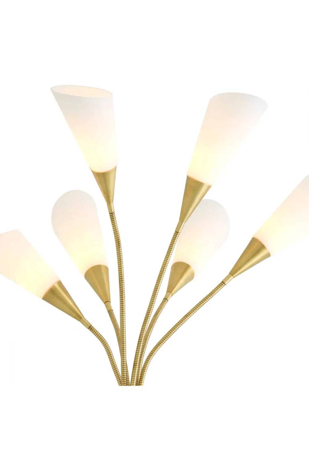 The lamp features six lights fanning out from a central stem, with fully adjustable flexible arms, making it a versatile designer floor lamp. Each arm is finished with conical white glass shades, creating a functional yet decorative decorative floor lamp and statement floor lamp suitable for lounges, hallways, bedrooms, or any living space.