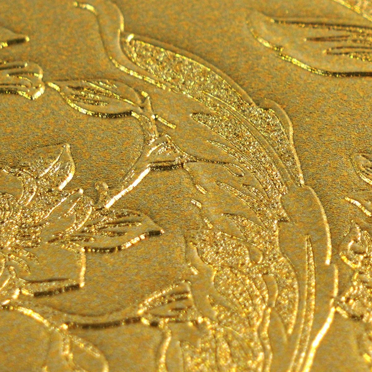 • glossy golden wallpaper finish reflects light beautifully while highlighting textured metallic floral designs