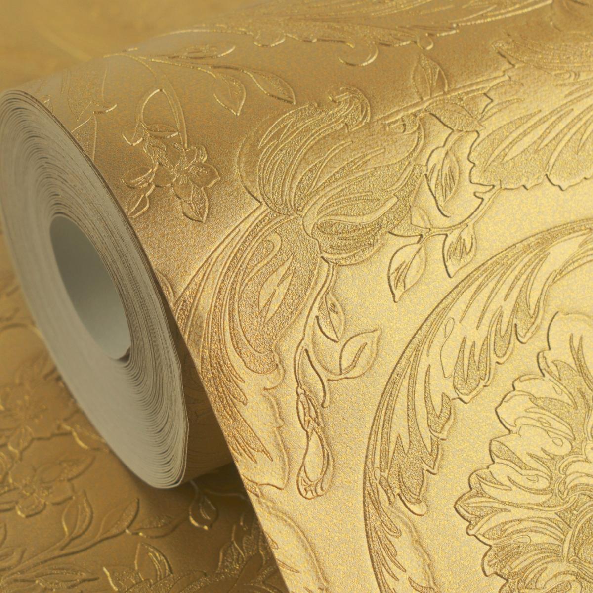 • luxury Antique gold Baroque floral Non-woven shimmer versace wallpaper with embossed botanical vines and shimmering antique gold metallic texture