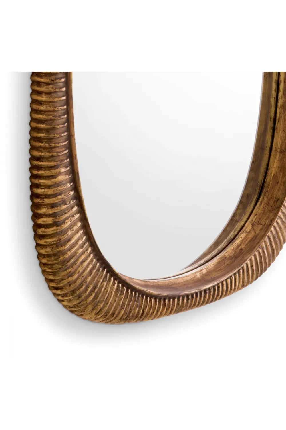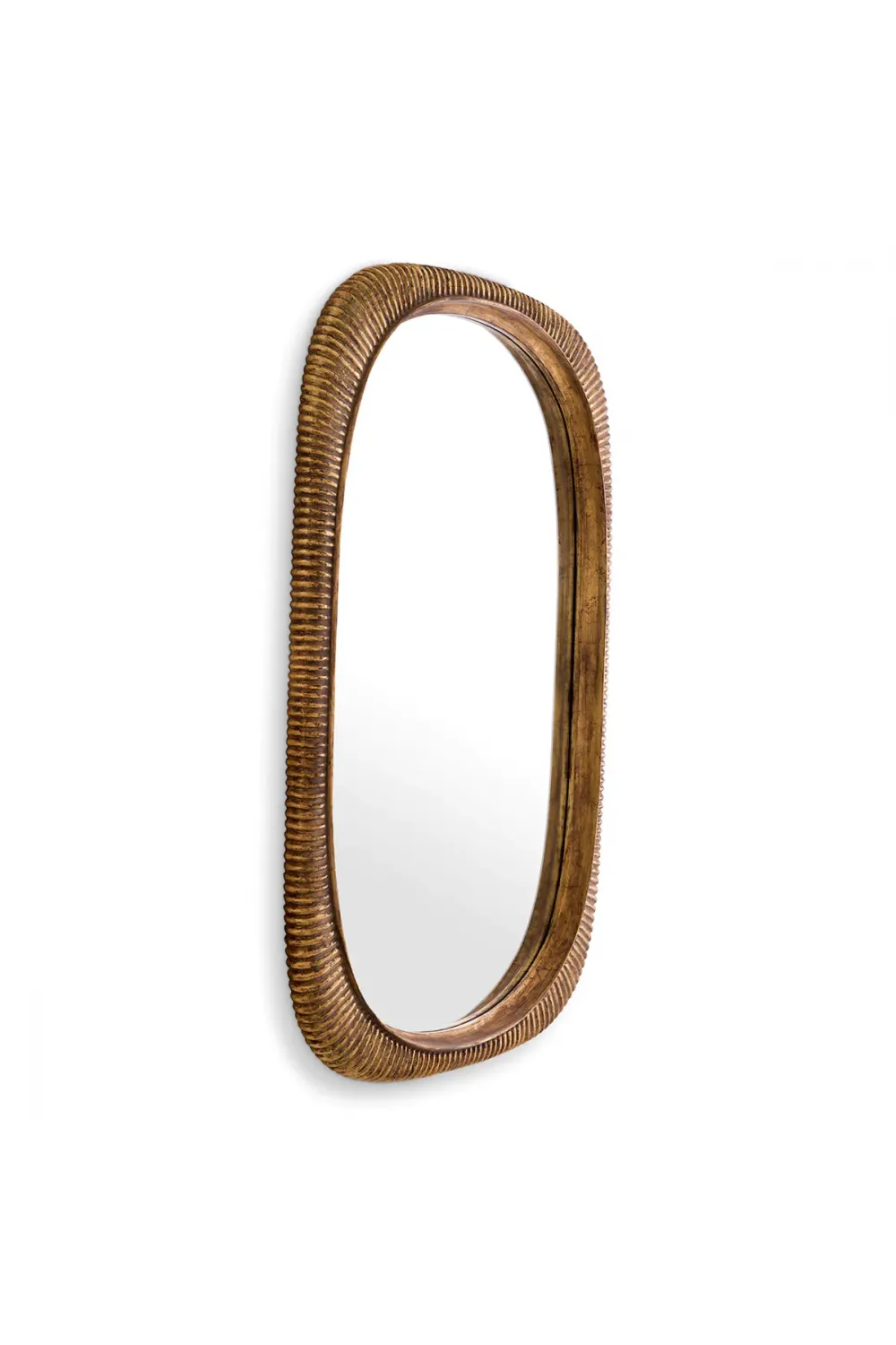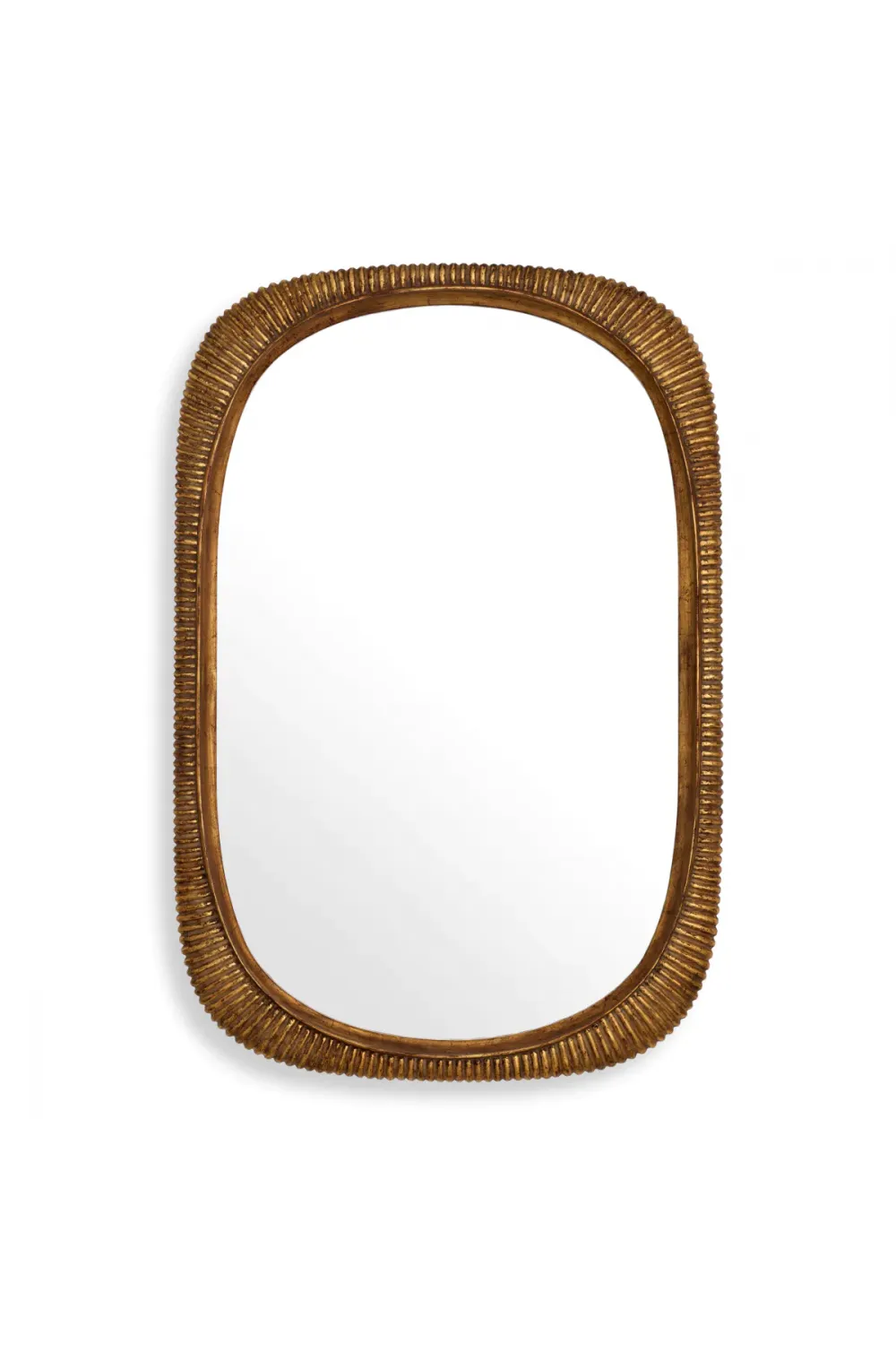 The Luxury Antique Gold Leaf Oval Mirror showcases the elegance of European artisanal craftsmanship through its ribbed mahogany frame and radiant antiqued gold leaf finish. The unique combination of a rectangular outer structure with gently rounded corners and an interior oval silhouette gives this luxury mirror a sculptural presence that enhances modern and classical interiors alike. Its hand-carved details and rich golden tones bring a sense of heritage and refinement to any space.