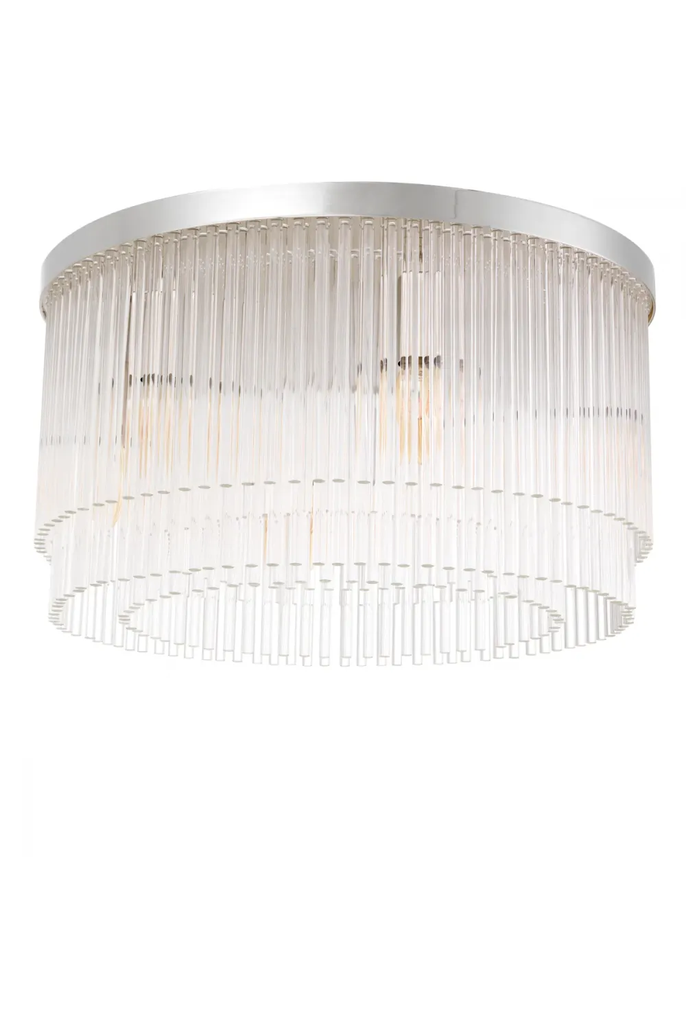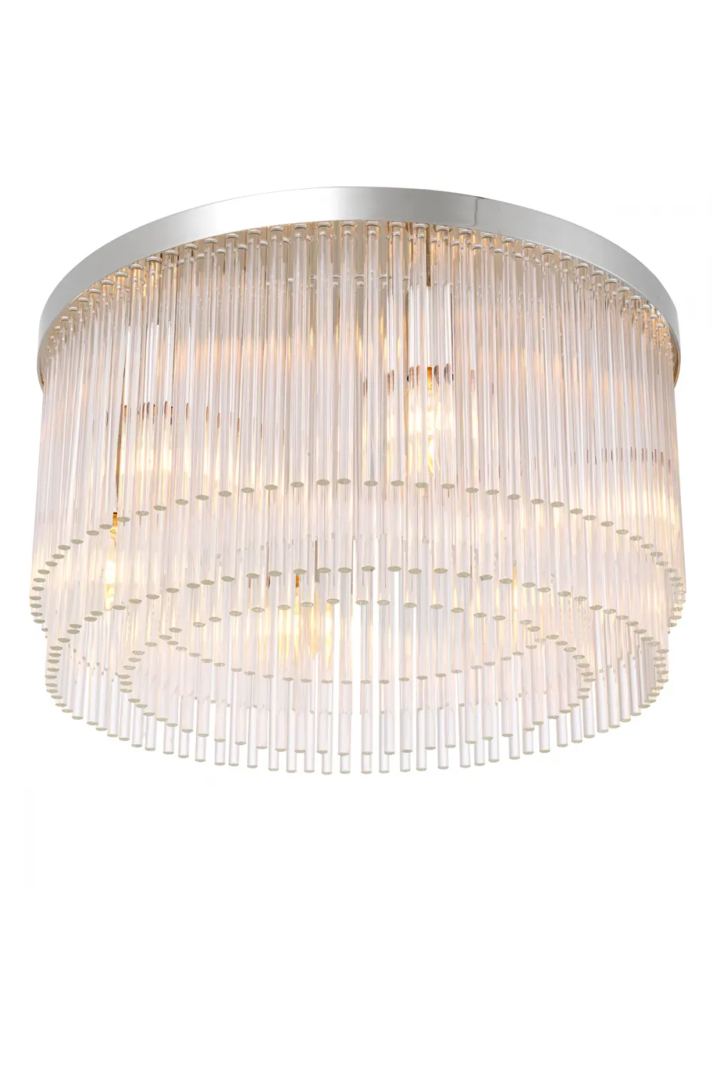 Its polished nickel-toned frame supports three concentric tiers of hand-assembled clear glass rods, each refracting light to create a spectacular interplay of shimmer and shadow.