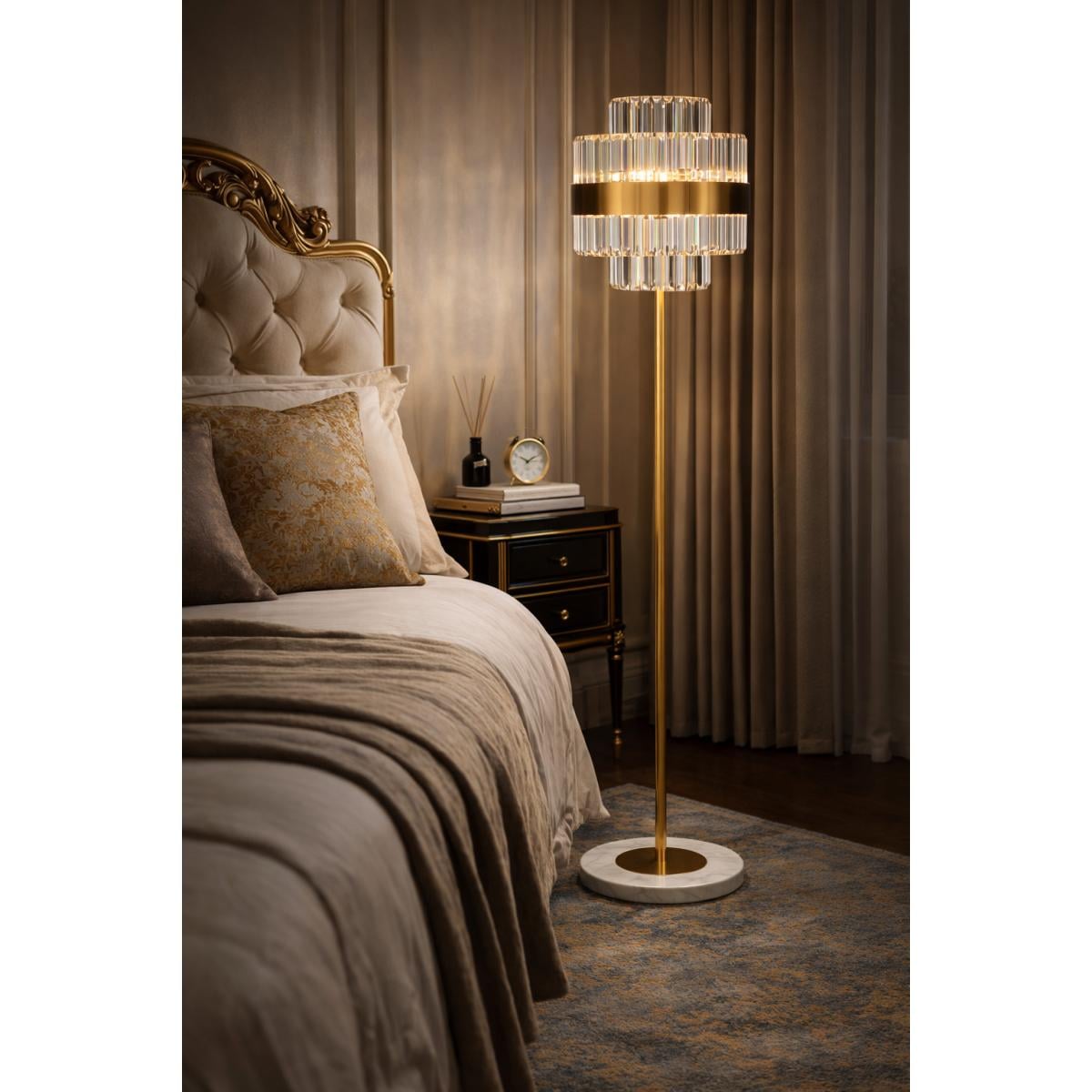 • Decorative Crystal Prism Floor Lamp with Brass Band and Marble Base designed for luxury living rooms, bedrooms, and hospitality interiors.