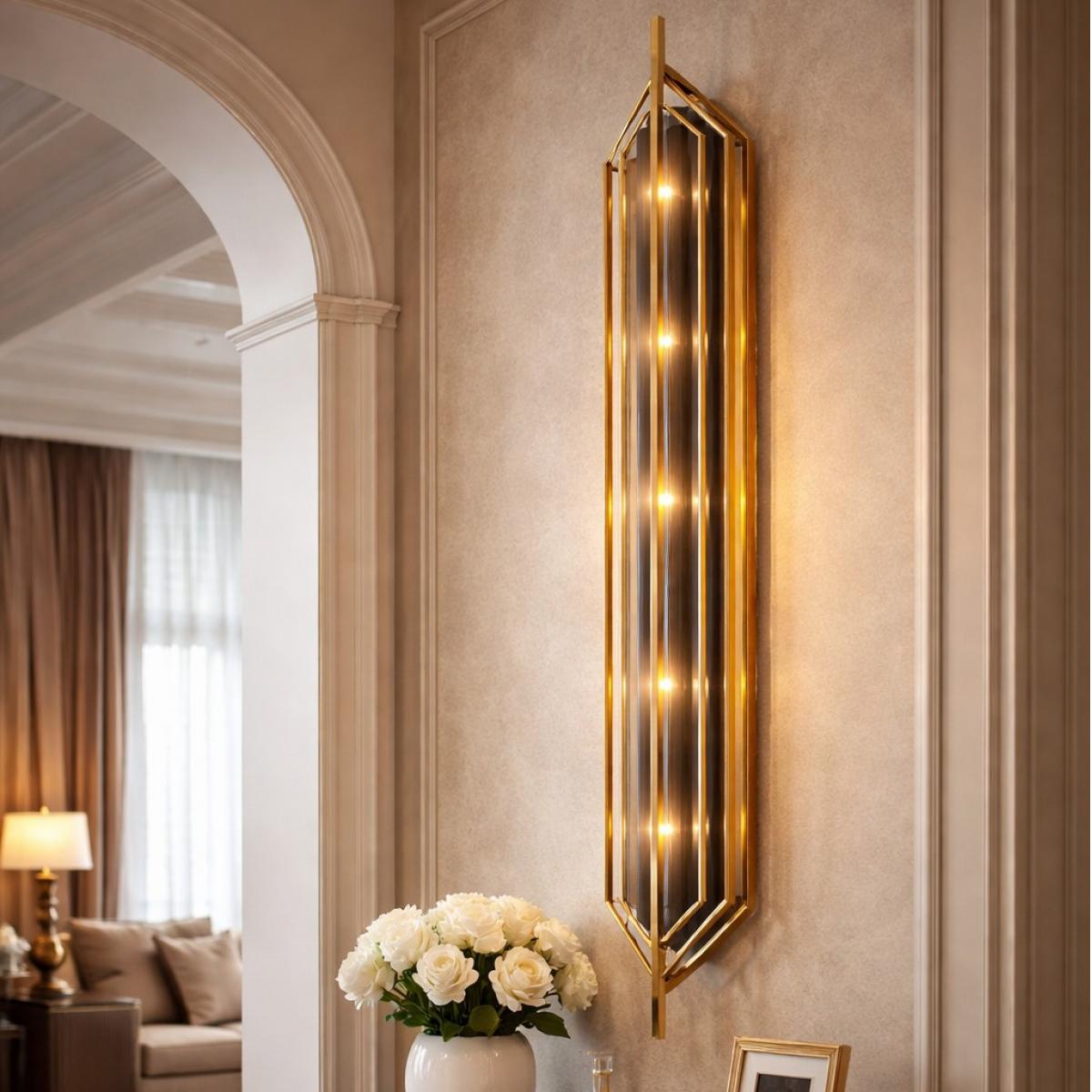 Luxury art deco gold finish Cylindrical modern glass Wall Lamp designed with a tall geometric frame and radiant glass panel to create refined ambient lighting. This luxury art deco gold finish Cylindrical modern glass Wall Lamp delivers elegant vertical illumination, making it a sophisticated gold finish Wall Lamp for luxury interiors.