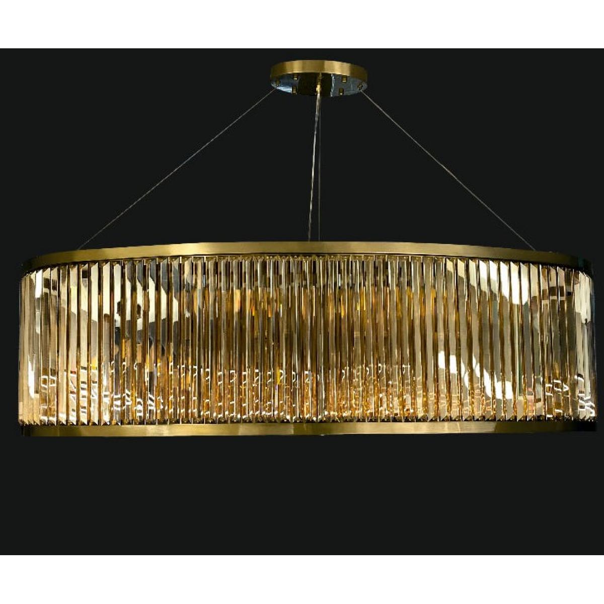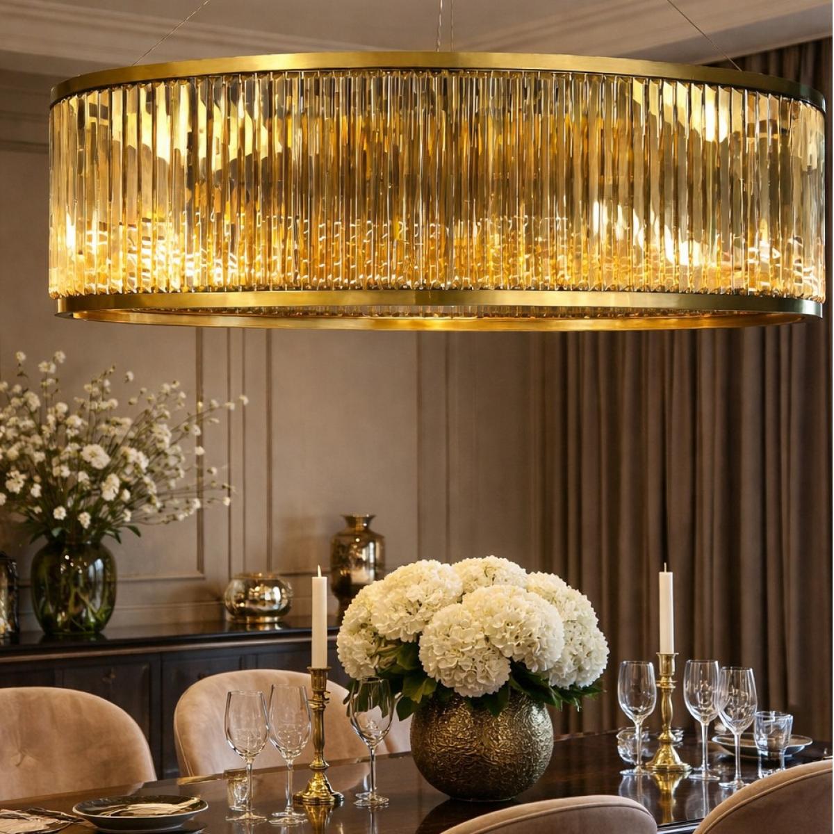 The Luxury Art Deco Golden Frame Oval Crystal Chandelier For Home Decor is a striking lighting centerpiece created for sophisticated European interiors. Designed with a graceful oval golden frame and meticulously arranged crystal rods, this chandelier produces a luminous cascade of reflections that elevate the atmosphere of any refined space. The sculptural form highlights the elegance of Art Deco geometry while maintaining a modern aesthetic suitable for contemporary luxury homes. Measuring approximately 135 × 60 cm with an elegant suspended height of 45 cm plus adjustable cables, this chandelier offers impressive presence while maintaining visual balance above dining tables, living spaces, or grand entryways. Crafted with premium metal and crystal materials, the fixture houses 12 E14 bulbs that provide radiant illumination while preserving energy efficiency. As a refined luxury chandelier, the piece seamlessly blends decorative artistry with practical lighting performance.
