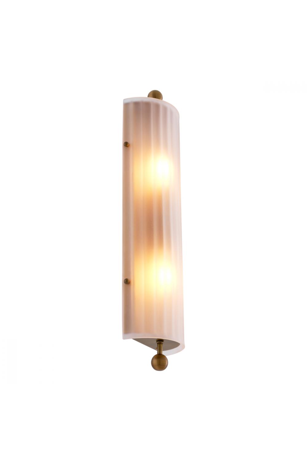 The vertically ribbed frosted glass softly diffuses light, producing a gentle, welcoming glow that enhances walls without harsh brightness. Encased in antique brass, the lamp reflects a timeless material palette associated with classic European craftsmanship. As a luxury wall lamp, it functions as both an architectural accent and a functional lighting solution, elevating interiors with understated sophistication.