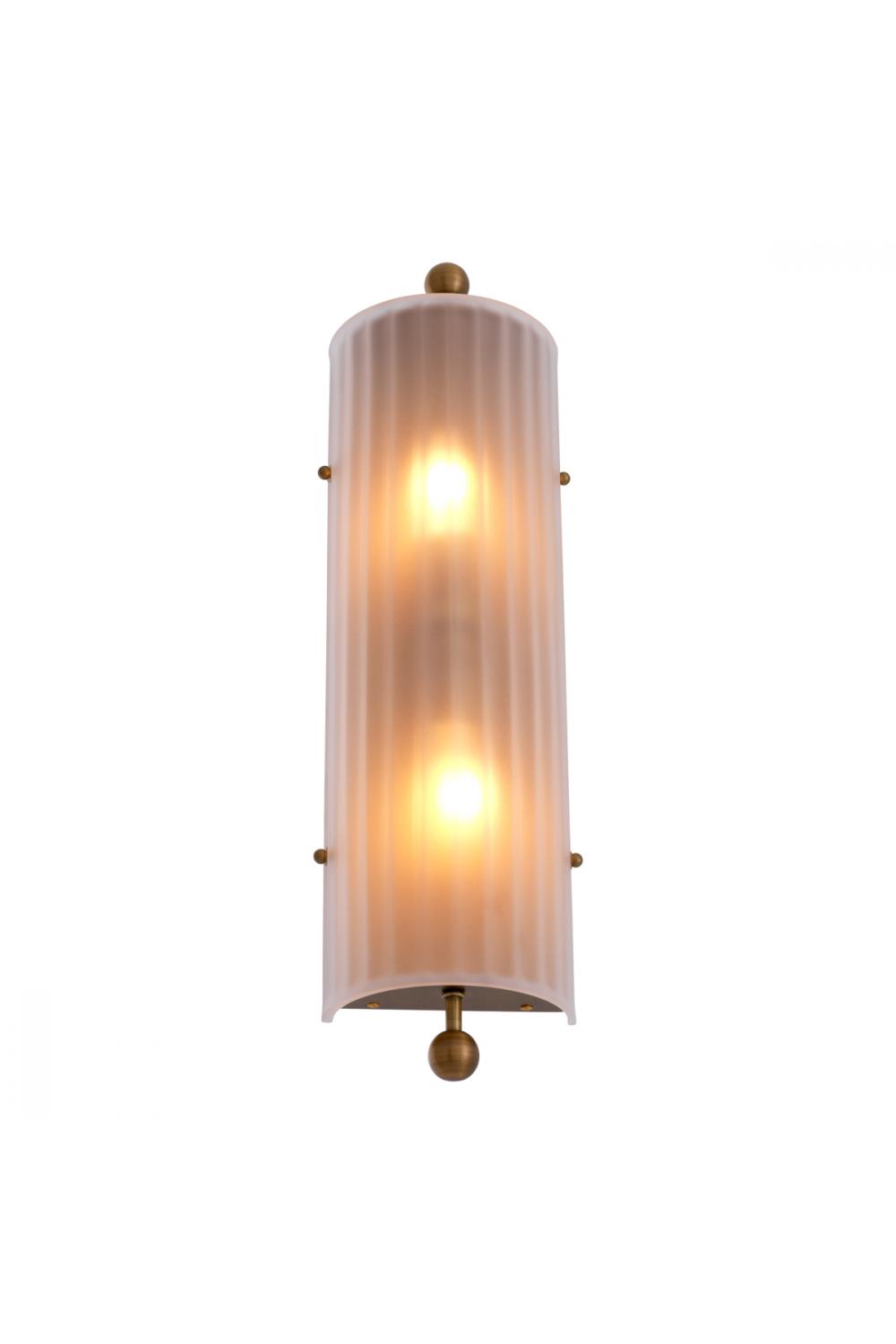Luxury wall lights inspired by Art Deco architecture bring sculptural depth and visual refinement to elegant European interiors. This wall lamp is defined by its tall, ribbed frosted glass form and warm antique brass finish, creating a harmonious balance between decorative presence and ambient illumination.