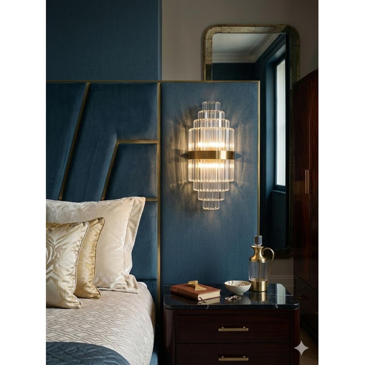 The Luxury Art Deco Tiered Crystal Wall Lamp with Brass Band is a sculptural lighting masterpiece inspired by the architectural elegance of 1920s Art Deco design. Crafted from vertically aligned crystal prisms arranged in a refined tiered silhouette, this striking wall fixture reflects light through precision-cut surfaces to produce an ambient sparkle reminiscent of luxury hotel interiors. The central brushed brass band elegantly anchors the structure, creating a harmonious contrast between the luminous crystal rods and warm metallic finish. With eight concealed G9 light sources diffusing illumination through crystal facets, this luxury Art Deco Tiered Crystal Wall Lamp with Brass Band transforms walls into radiant focal points.