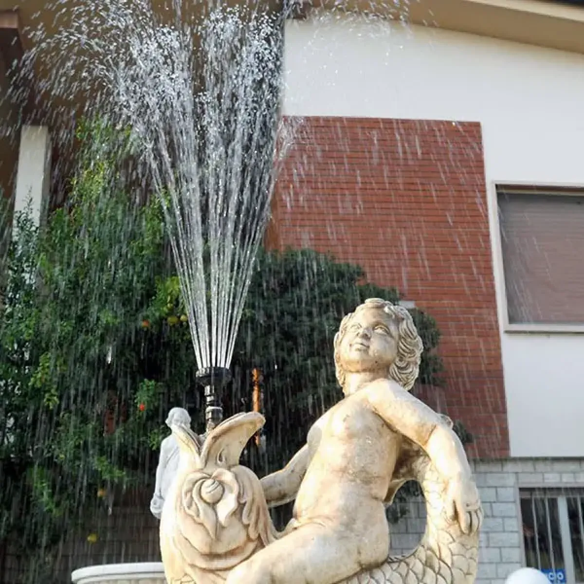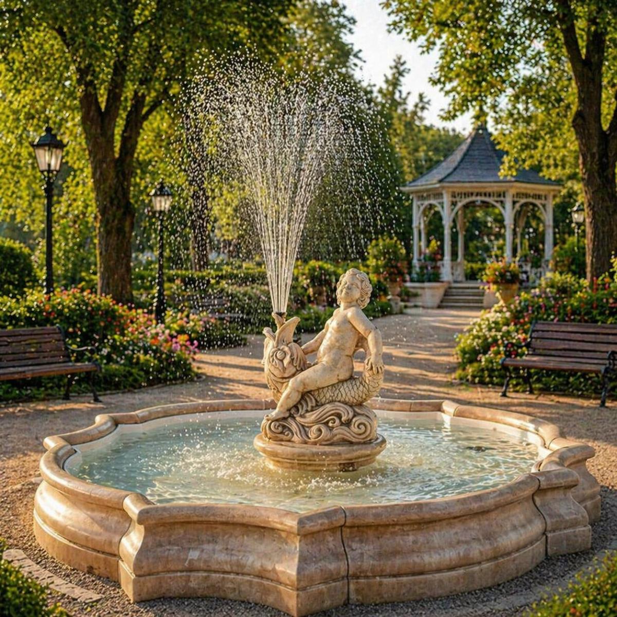 The Luxury Baroque Cherub Sculpture Water Fountain with Multi-Curve Reservoir is a visually captivating outdoor centerpiece that combines classical sculpture with refined water design. This exquisite baroque fountain features a beautifully detailed cherub figure positioned atop a decorative base, bringing a sense of movement and storytelling to the composition. Behind the sculpture, a vertical multi-jet spray rises gracefully, creating a dynamic water display that enhances the fountain’s overall presence and elegance.