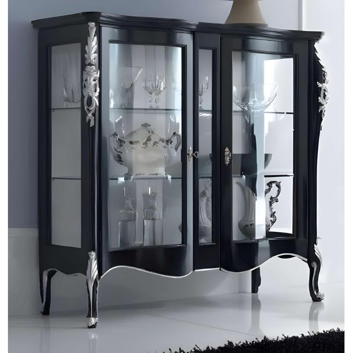 Luxury Baroque Wooden Display Cabinet with Double Glass Doors in Black Finish and Sculpted Frame by Luxury Group International