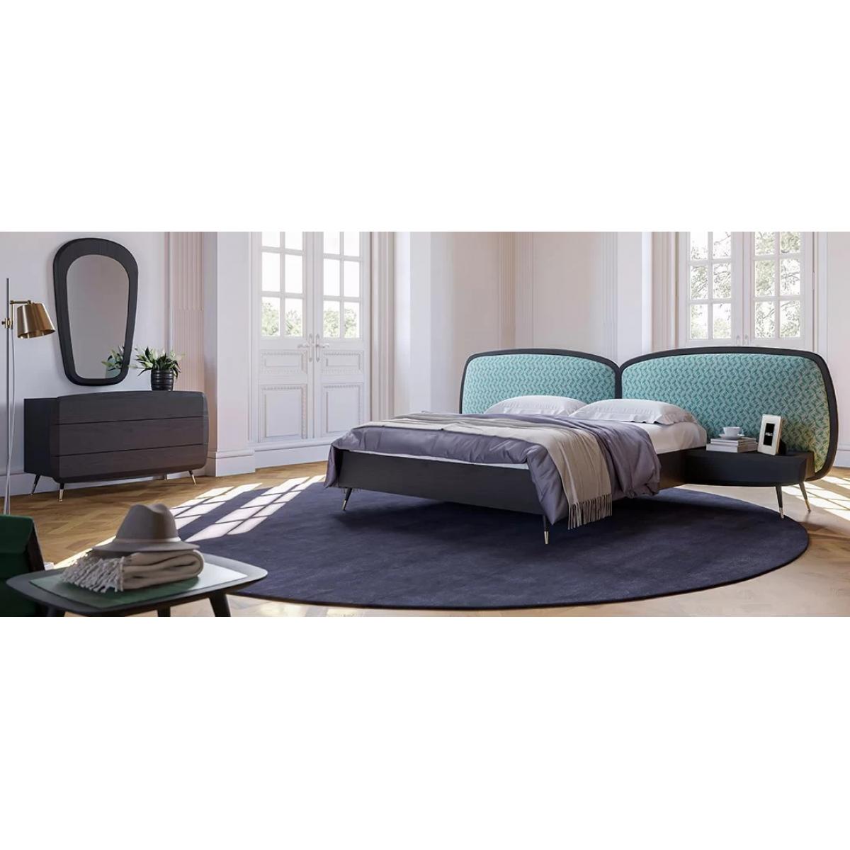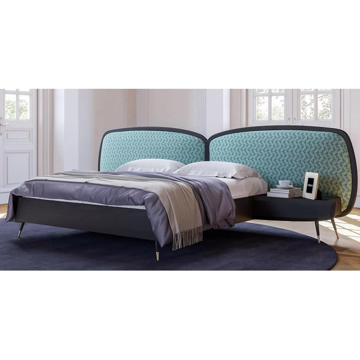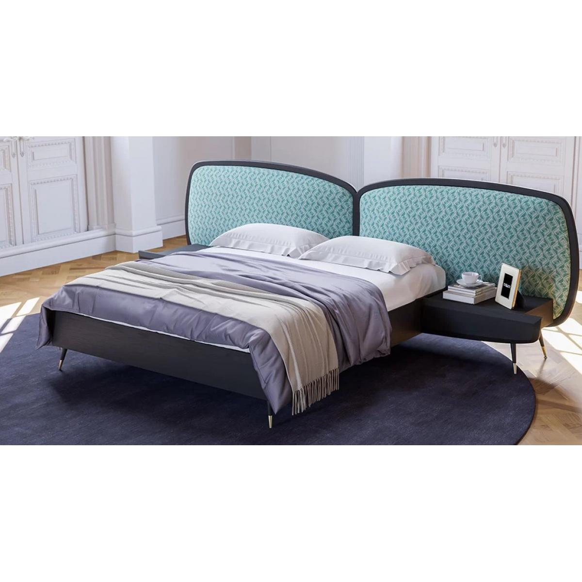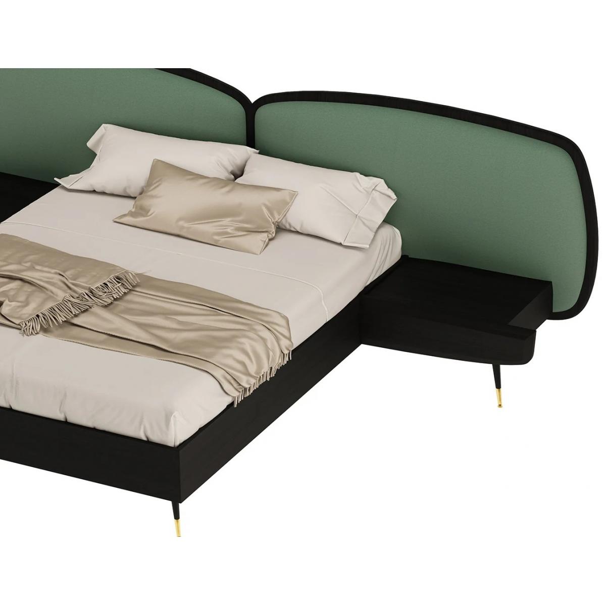 Luxury bedroom set green / black -1 Double Bed with Headboard & 2 Bedside Tables - Luxury bed featuring sculptural dual curved headboard, integrated bedside platforms, and antique brass accents. This luxury bed delivers refined European elegance, premium comfort, and modern designer styling.