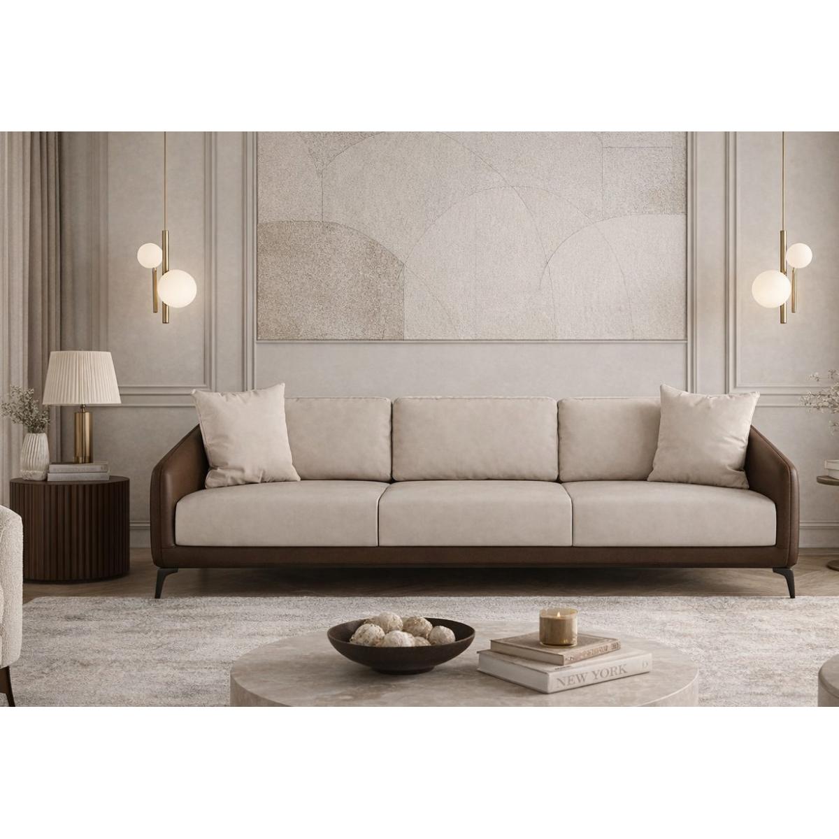 Luxury Beige & Brown 3 Seater Modern Designer Sofa with Leather Frame - Luxury Sofa featuring premium dual-tone upholstery, structured seating comfort, and sleek tapered legs. This Modern Designer Sofa offers refined European styling, deep cushioning, durable leather frame, and elegant proportions ideal for luxury living spaces.