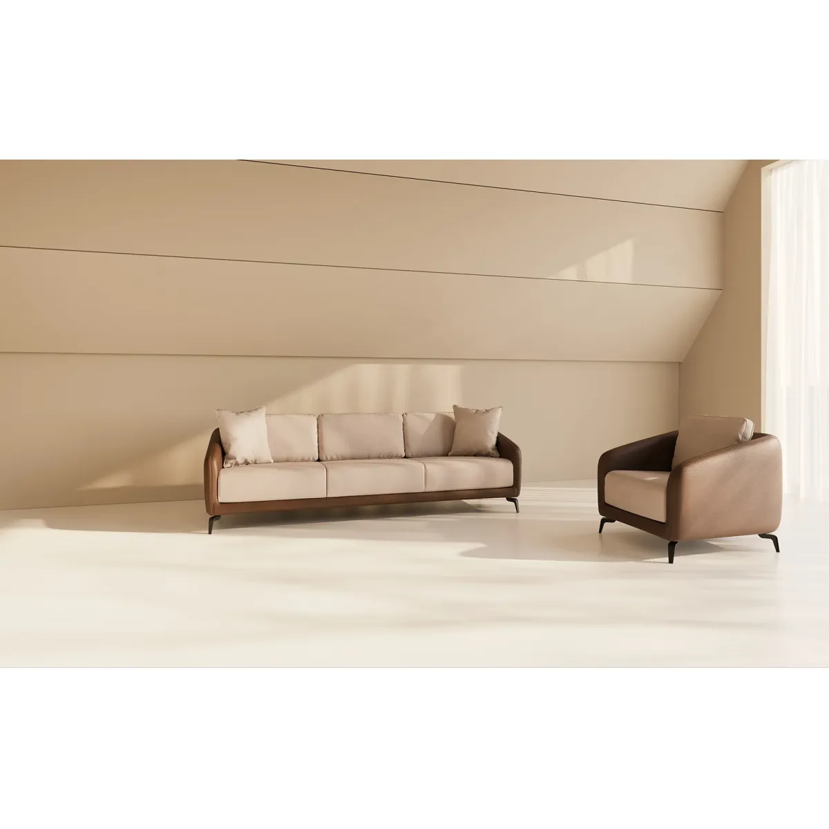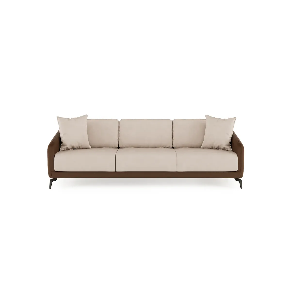 The Luxury Beige & Brown 3 Seater Leather Frame Modern Designer Sofa – Luxury Sofa reflects modern European elegance through its sophisticated dual-tone composition and refined silhouette. This Luxury Beige & Brown 3 Seater Modern Designer Sofa with Leather Frame - Luxury Sofa features premium beige upholstered seating balanced with a rich brown leather outer frame that enhances its architectural presence. The sleek tapered legs provide a floating appearance while maintaining stability and durability. Designed with deep cushions and structured support, this Luxury 3 Seater Sofa delivers exceptional comfort while maintaining a clean, contemporary aesthetic suitable for luxury homes and hospitality interiors.
