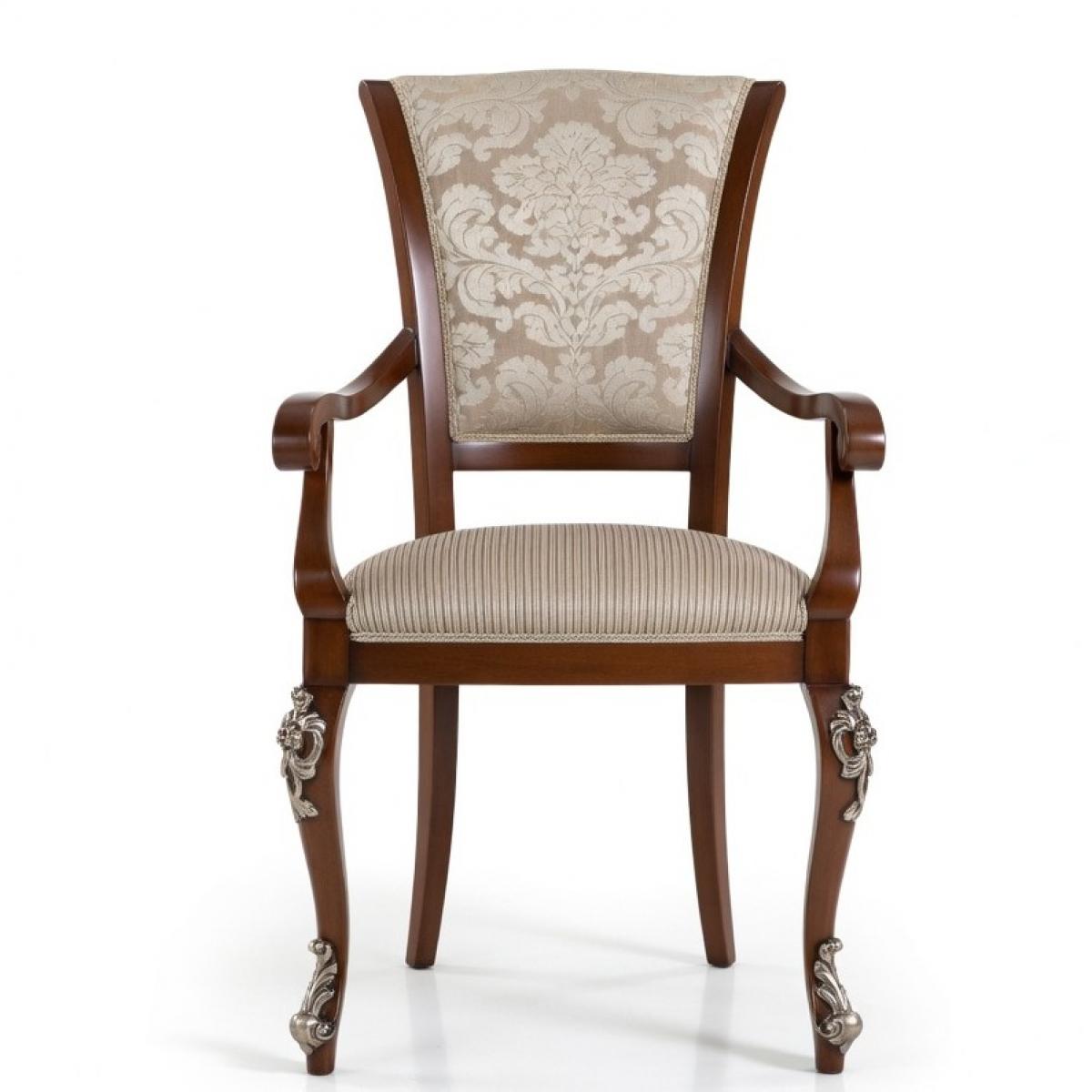 Luxury Beige Damask Upholstered Dining Armchair with Scroll Arms & Silver Sculpted Wooden Legs by Luxury Group International
