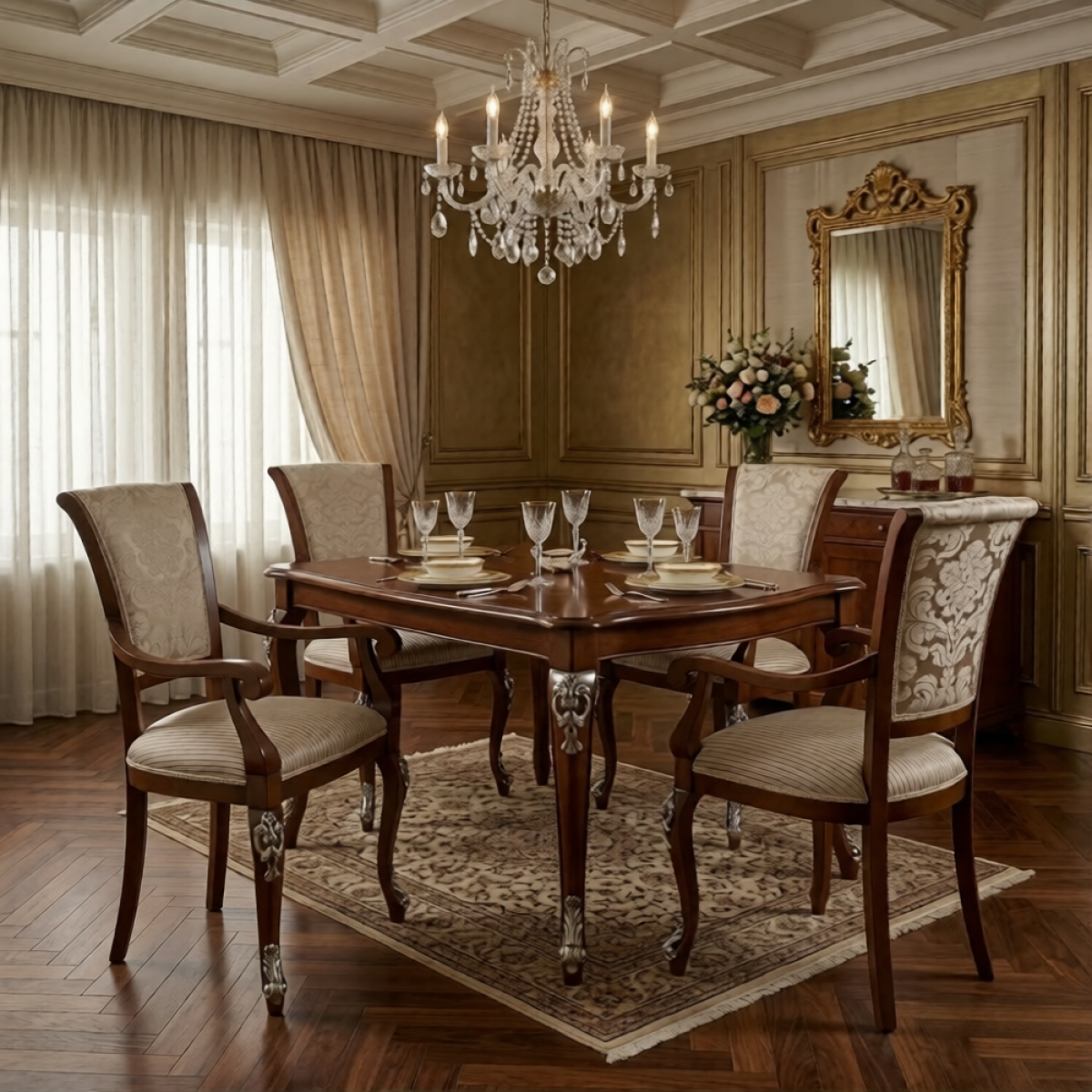 To bring the full vision of your dining room together, explore our curated selection of luxury dining tables — each piece chosen for its quality of materials, proportion, and European craftsmanship. The warm walnut frame, soft champagne damask upholstery, and silver sculpted leg detail of this armchair make it a versatile and enduring center piece, sitting with equal ease at the head of both light marble and deep walnut finished dining tables — completing a dining space that feels genuinely luxurious, harmonious, and crafted with care.