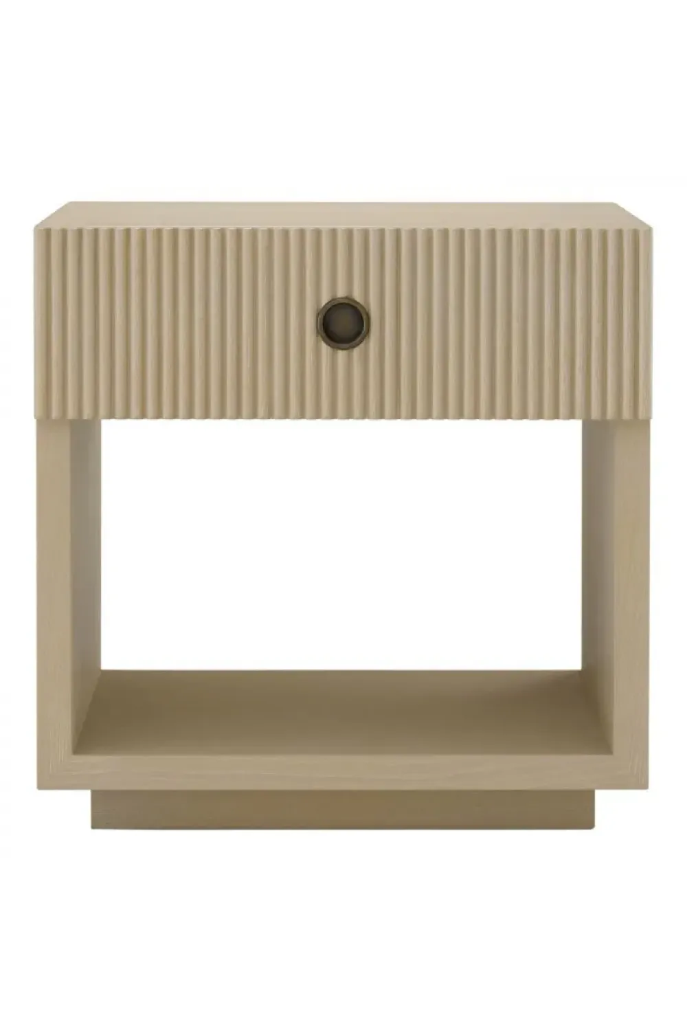 This luxury beige nightstand features a striking charcoal oak veneer complemented by ribbed wooden panels and a sophisticated bronze finish. Perfect for elevating your bedroom, it combines elegance and function in a sleek, modern design.