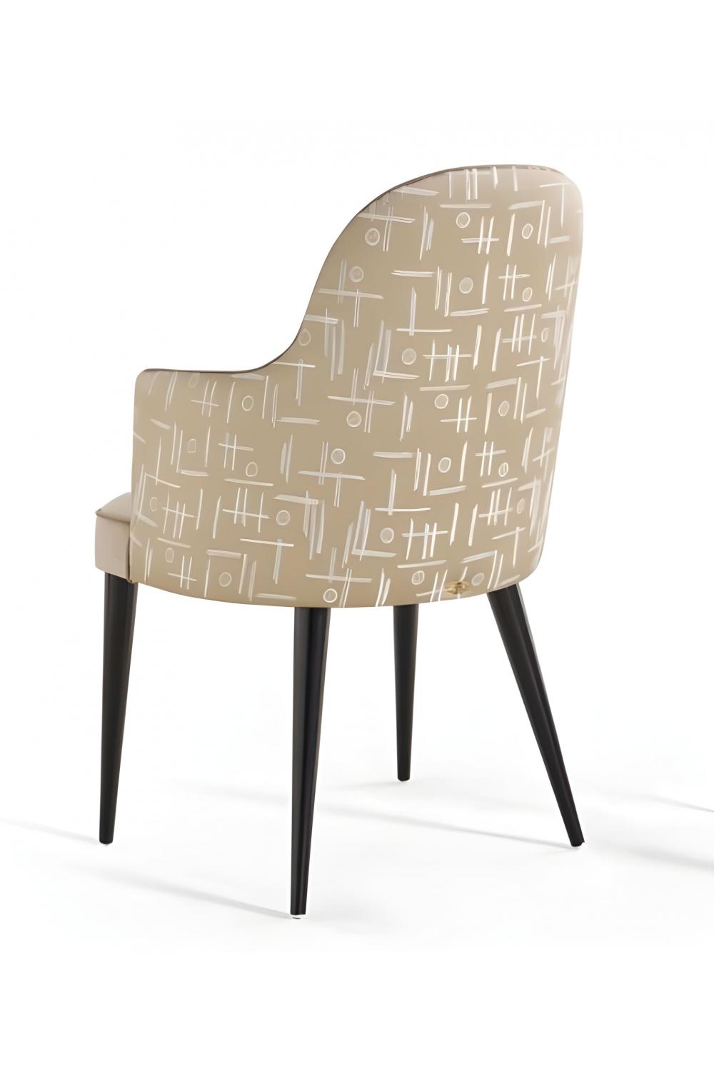 This luxury upholstered dining armchair features soft beige upholstery with a unique artistic back design, complemented by sleek dark wooden legs. Perfect for luxury chairs for dining room collections, this armchair combines elegance and comfort, making it an ideal addition to any luxury dining chairs setup.