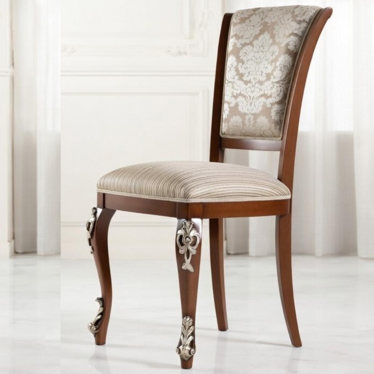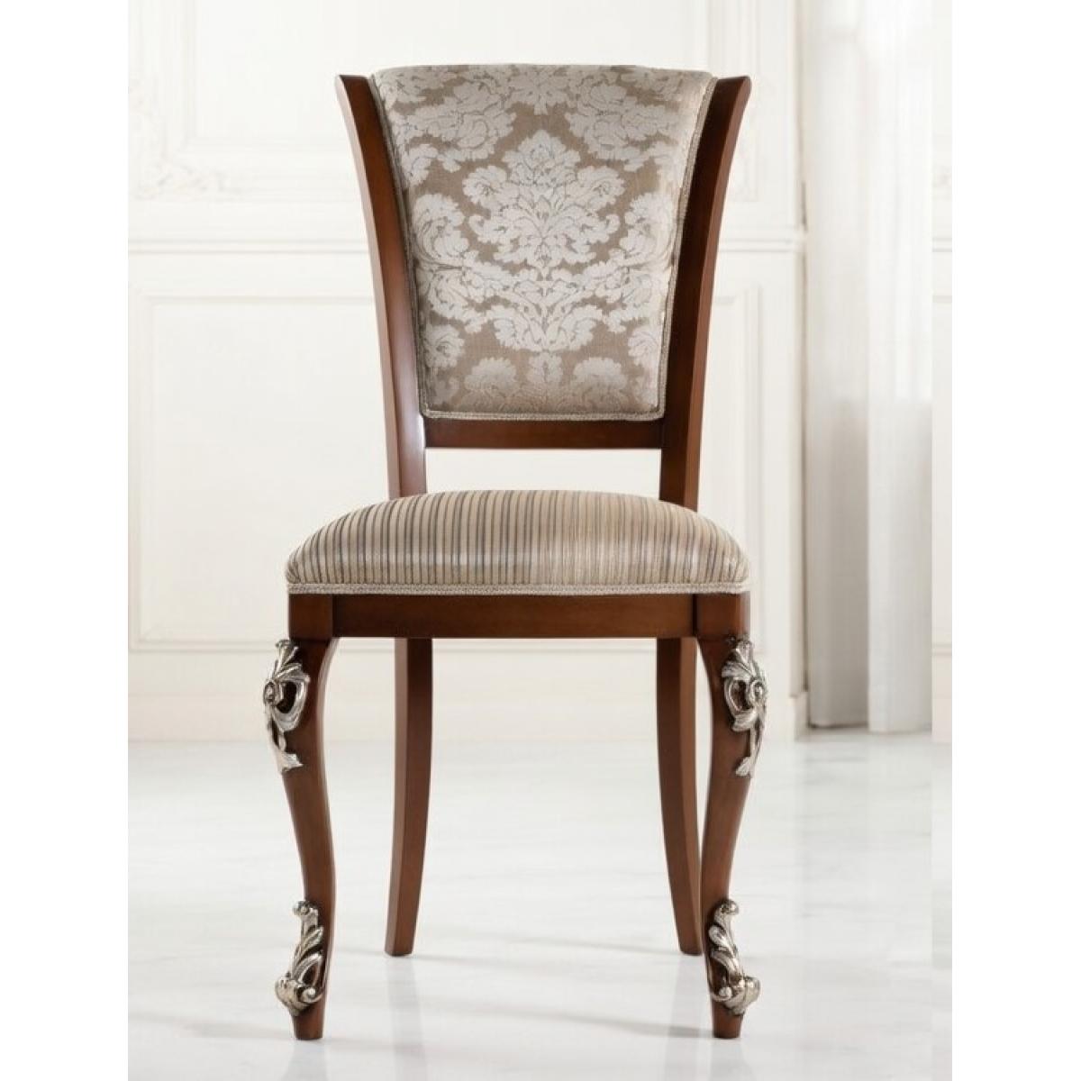 Bring timeless European elegance to your home with this luxury upholstered dining chair, beautifully dressed in champagne damask fabric and fine cream stripe seat upholstery. A refined luxury chair for dining room settings, elevated by silver sculpted cabriole legs and rich walnut woodwork.