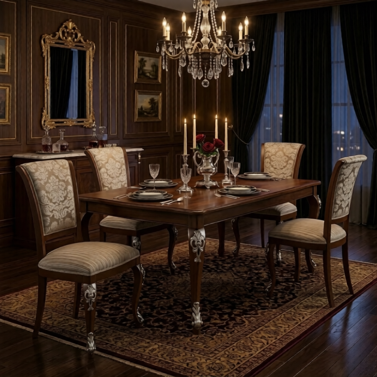 The Luxury Beige Upholstered Dining Chair with Damask Fabric Backrest & Silver Sculpted Cabriole Wooden Legs is a beautifully crafted seat that brings the warmth and grandeur of classical European design into your dining room. This luxury upholstered dining chair features a gently flared backrest dressed in a stunning champagne and ivory damask fabric, with an elegant floral pattern that speaks softly of old-world European refinement. The generously cushioned seat is upholstered in a coordinating cream pinstripe fabric, finished with a neat decorative trim along the edge — a small but considered detail that sets this chair apart. The solid hardwood frame is finished in a rich warm walnut tone, flowing gracefully into curved cabriole front legs, each adorned with a beautifully detailed silver sculpted ornamental carving — adding a touch of glamour and artisan character to every angle of the chair.