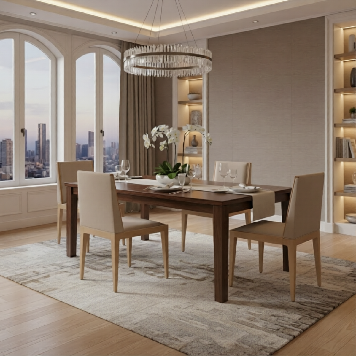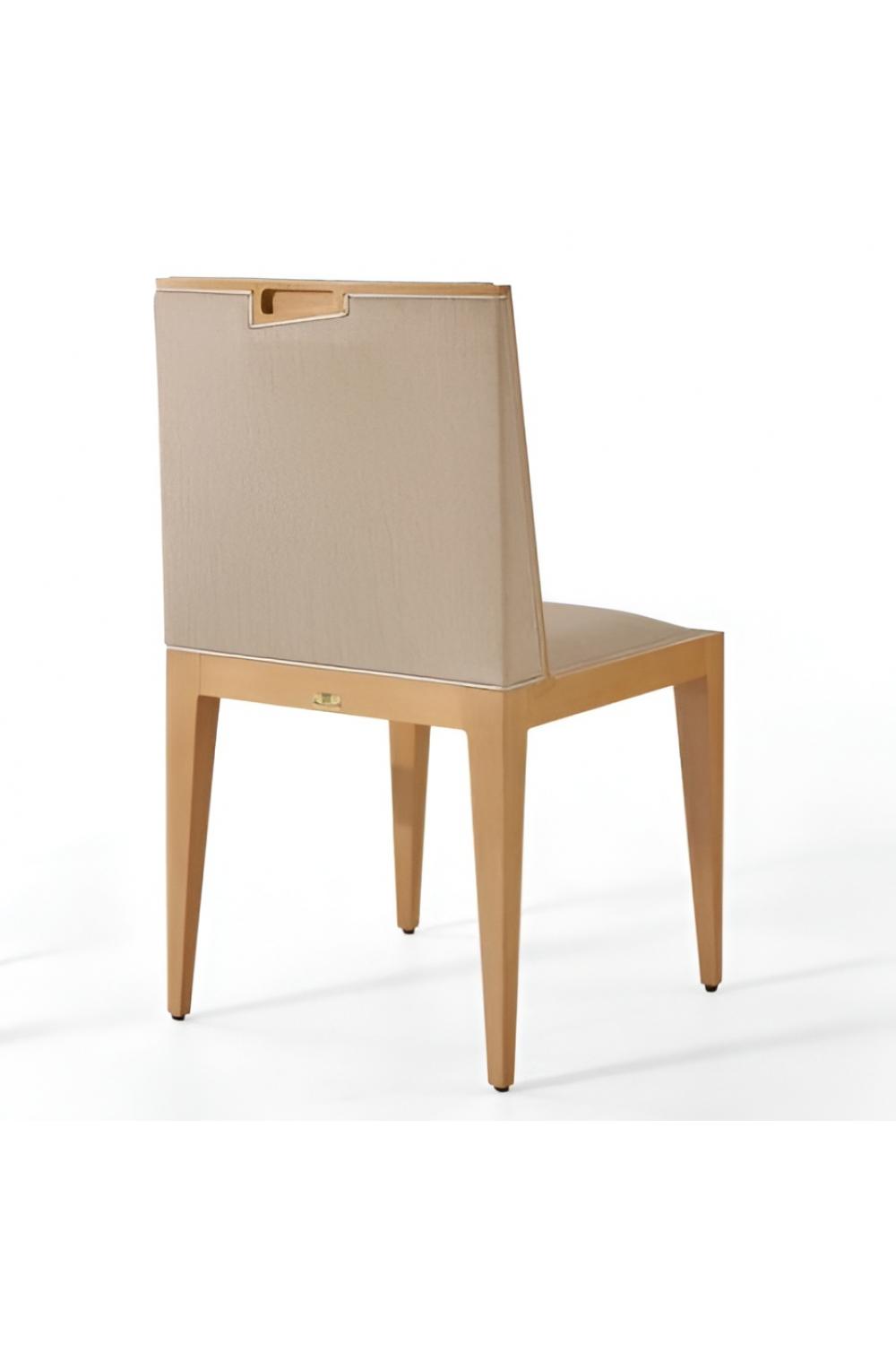 This luxury upholstered dining chair features a sleek beige fabric upholstery and finely crafted wooden legs, adding elegance to any dining space. Perfect for elevating luxury dining chairs collections, this chair combines modern sophistication with comfort, making it an excellent addition to any luxury chairs for dining room arrangement.