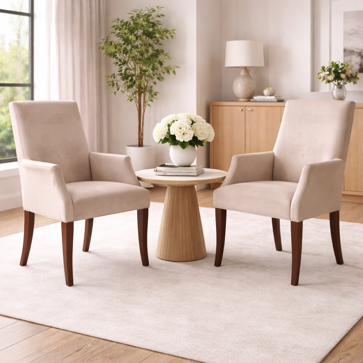 The Luxury Beige Upholstered High Back Dining Armchair with Walnut Curved Legs embodies refined European dining sophistication. This distinguished luxury upholstered dining armchair features a tall, gently contoured backrest that enhances posture while adding architectural presence to the dining setting. The integrated armrests create a harmonious silhouette, offering comfort without compromising elegance. Upholstered in warm beige fabric and supported by gracefully curved walnut legs, the chair delivers both visual softness and structural integrity.