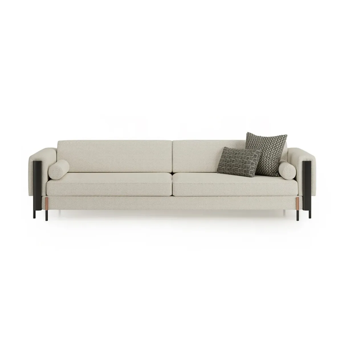 Luxury Beige Upholstered Modern Sofa with Black Metal Arm Accents & Designer Cushion Set-Luxury sofa defines contemporary European sophistication through its seamless blend of soft upholstery and architectural metal detailing. Designed with a linear silhouette and refined proportions, this sofa showcases a premium beige textured fabric that enhances its elegant presence. The bold black metal arm accents introduce contrast and structure, elevating the visual identity of this Luxury Beige Upholstered Modern Sofa with Black Metal Arm Accents & Designer Cushion Set. Built with a solid hardwood frame and high-density cushioning, it delivers exceptional durability while offering deep, supportive comfort for everyday luxury living.