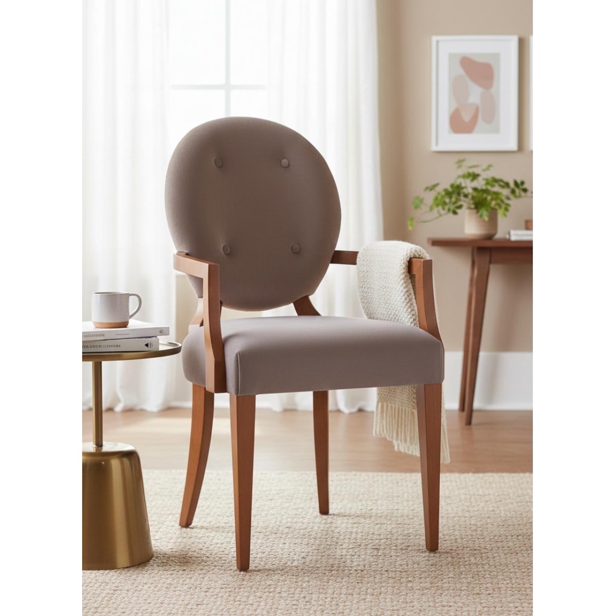 This luxury upholstered dining armchair features plush beige velvet upholstery with a button-tufted back and elegant wooden legs. Ideal for luxury chairs for dining room collections, this chair brings a sophisticated touch of comfort and style to any luxury dining chairs setup.